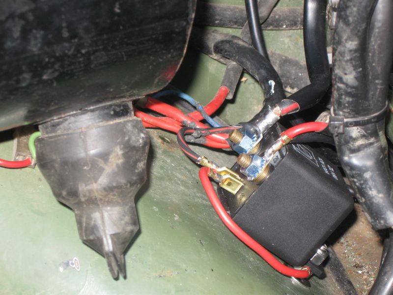 | Das Relais habe ich links neben der kleinen Verteilerplatte unter dem Luftfilter eingebaut. Dadurch habe ich kurze Kabelverbindungen, da in dem Verteiler die Leitungen vom Zündschloss und Magnetschalter vom Anlasser enden und die Vorsicherungen in der Nähe sind. | ![]() |