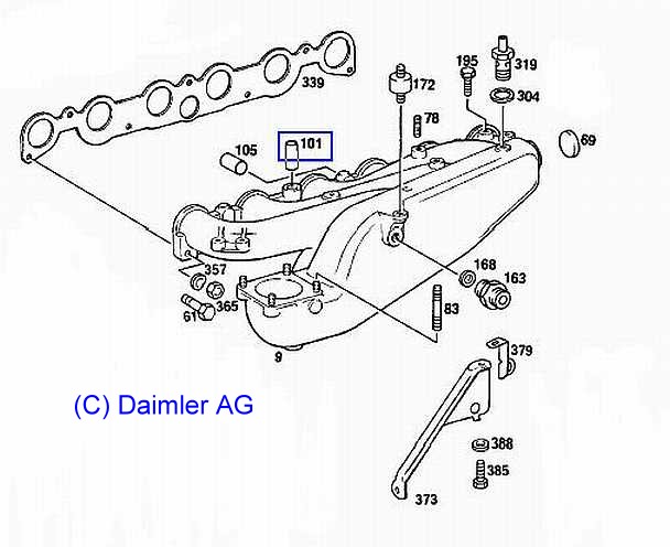 | Interessant sind die Verbindungen zwischen den Ansaugkanälen für den Leerlauf. Der Anschluss in der Mitte der Kanäle führt mit dem Schlauch A110-094-1682 zum Leerlaufluftverteiler. | ![]() |
