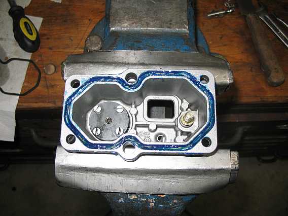 Die umlaufende Gummidichtung ist zusammengepresst und dichtet nicht mehr ab. Ersatz gab es nicht. Ich legte in die Gehäusenut eine dünnen Hanfschnurr ein und gab Dichtungsmasse (Ölwannenflüssigdichtung) hinzu, darauf kommt die Gummidichtung. Sie ragt nun etwas aus der Nut heraus. Inzwischen gibt es die Vierkanntdichtung als Ersatz bei www.ferrari400parts.com, z.B. auch die Dichtung des Warmlaufreglers. |