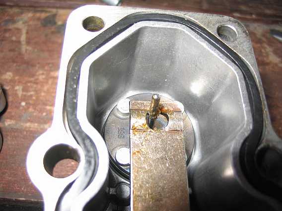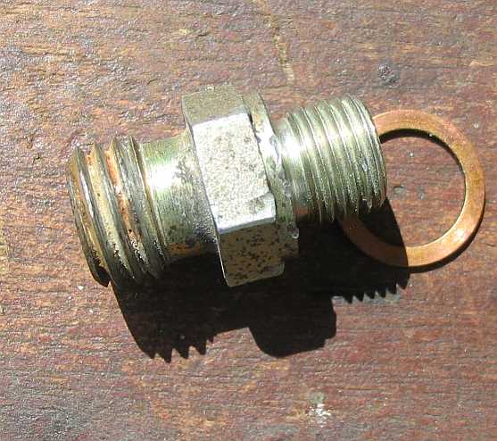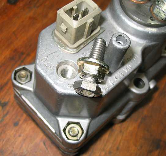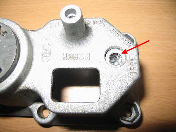 | Nun wird mit einem kleinen Hammerschlag auf die Schraube der Bolzen tiefer gesetzt, so dass die Mutter am Gehäuse anliegt. Zum Justieren des nun zu niedrigen Startsteuerdrucks wird durch vorsichtiges Anziehen der Mutter der Bolzen wieder etwas herausgezogen, bis der Startsteuerdruck stimmt (siehe Steuerdruck messen). Bei 0,5 mm tiefer eingeschlagenem Haltebolzen lag der Startsteuerdruck um 0,3 bar niedriger (bei 0,6 bar schlechter Motorleerlauf). | ![]() |