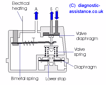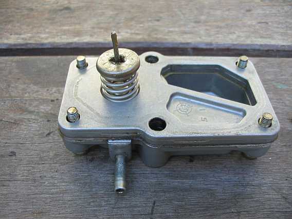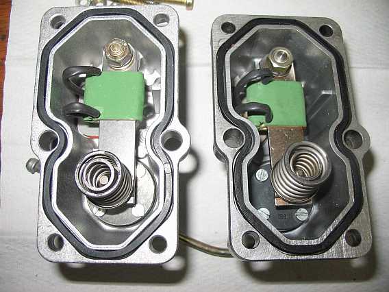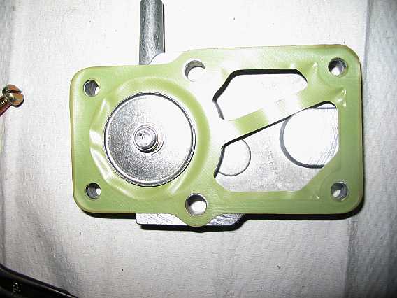 | Eine große und eine kleinere Feder drücken über eine Druckscheibe ("Hütchen") und einen Druckbolzen auf das Flachsitzventil. Der Fusspunkt der inneren kleinen Feder ist unterdruckabhängig verschiebbar. Damit wird die Gesamtcharakteristik der beiden Federn etwas geändert. |