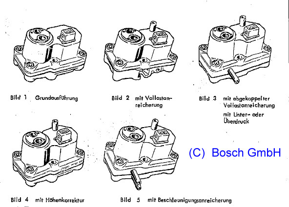 Die WLR mit den Bosch-Endnummern XYZ haben für die Volllastanreicherung den Saugrohr-Unterdruckanschluss seitlich am Unterteil. Bei abfallendem Unterdruck wird die innere Druckfeder entlastet. Der obere Anschluss dient der Belüftung und ist an der Leckleitung vom Kraftstoffdämpfer angeschlossen. Bosch-Endnummer: 060: 35 Ohm, abgekoppelte Volllastanreicherung, 2 Membranen, Saugrohrdruck bestimmt Steuerdruck 061: wie 60, nur 26 Ohm 103: wie 060, anderer Ohmwert, andere Einstellung 134: wie 061, anderer Ohmwert, andere Einstellung, Steuerdruck 3,6 bar 145: wie 057, mit Thermoschalter, Steuerdruck 3,6 bar 152: wie 057, mit Schraubstutzen |