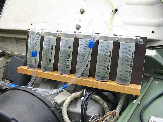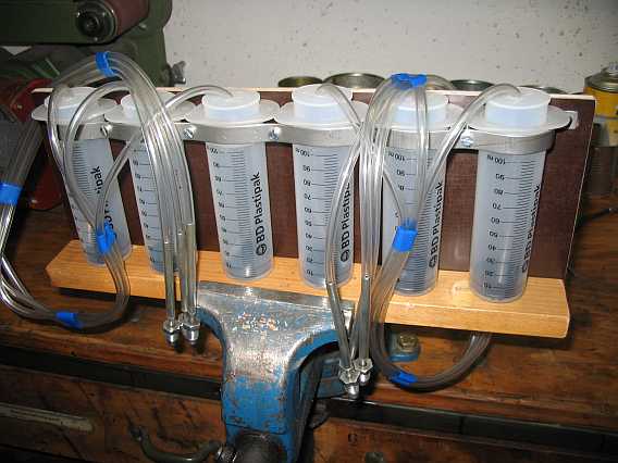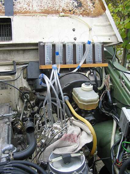 Die Common-Rail-Prüfsysteme, z.B. das der Fa. Leitenberger/Autotestgeräte, ermöglichen die Bestimmung der Rücklaufmenge der Injektoren. So ein ähnliches Prüfsystem kann man für den Mengenteiler beim 280GE auch selber bauen. Dazu benötigt man einen Satz Metall-Benzinleitungen, sechs benzinfeste 100 ml Einmalkunststoffspritzen (BD Plastipak, Polyethylen) mit Skalierung sowie 6 mal einen Meter eines Kunststoff-Benzinschlauches (6 mm Außendurchmesser) als Leitung zu den Messbechern. |