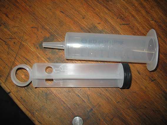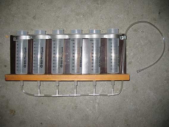 | Ein passend gebogener Metallstreifen mit Verschraubungen hält die Zylinder an der Rückwand fest. Mit der Kanüle am Boden des Zylinders stecken sie in Löchern im Bodenbrett. | ![]() |