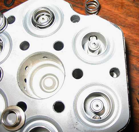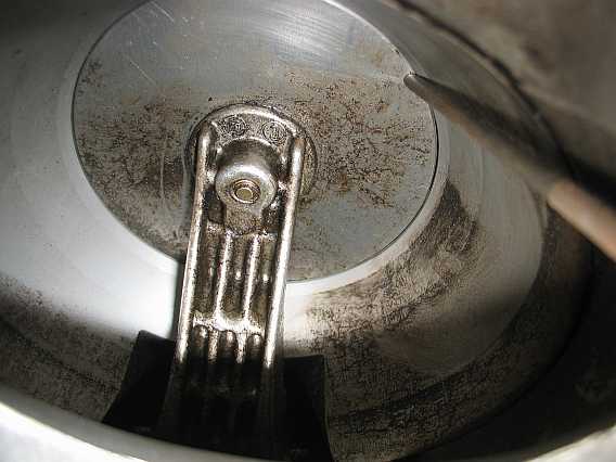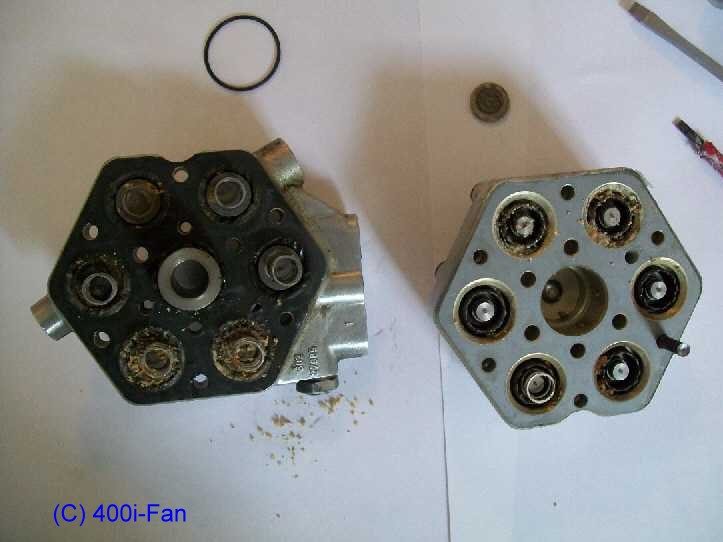 | Auf den Federn liegen die weißen Kunststoffventilteller. Darauf liegt die Membran, die Ober- und Unterkammer trennt und alles abdichtet | ![]() |
