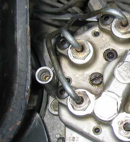 | Sechs Einspritzleitungen führen zu den sechs Einspritzdüsen (siehe Bericht). Neben den Schraubstutzen für die Einspritzleitungen sind sechs Verschlussschrauben (3,5 mm Inbus). Die darunter liegenden Einstellschrauben für die Differenzdruckventile sind ab Werk eingestellt und sollten nicht verstellt werden. Man benötigt zur Einstellung einen Mess-/Testplatz mit einem Differenzdruckmanometer mit zwei Anschlüssen. | ![]() |