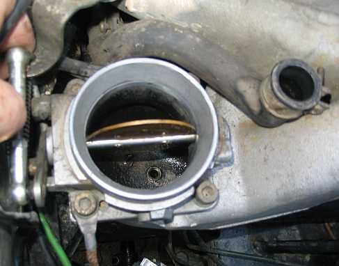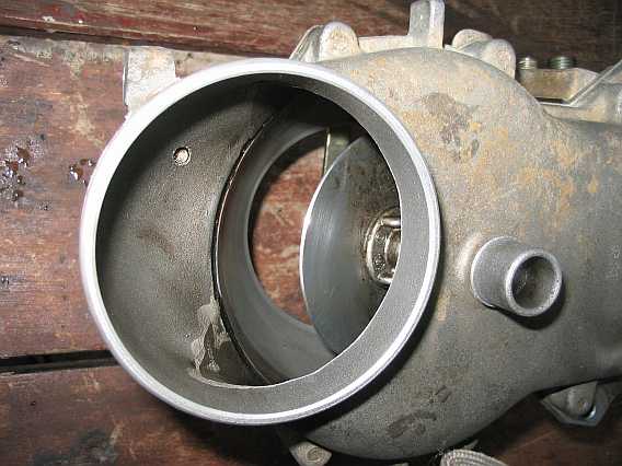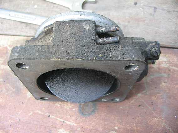 | Die Unterseite der Drosselklappe kann auch mal gereinigt werden. Die Schlitzschraube für die Grundjustierung habe ich durch eine Schraube mit Kopf ersetzt, sie läßt sich später leichter verdrehen. | ![]() |