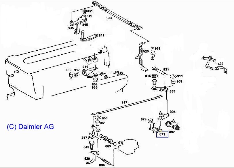 Nr.933: Steuerdruckstange Steuerdruckstange einstellen: RA27004600023Z Beim 280GE ist der Steuerdruck ein Teildruck des Modulierdruckes in Abhängigkeit von der Gaspedalstellung. Sind der Modulierdruck und das Steuerdruckgestänge richtig eingestellt, ergibt sich der richtige Steuerdruck. |