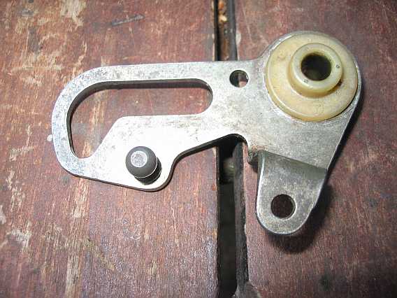 | Ein Hebelarm trägt auf der einen Seite die Stauscheibe, die andere Seite ist gabelförmig und trägt das Gegengewicht. Ein zweiter Hebelarm sitzt in der Gabel auf der gleichen Achse. Er drückt mit einer Rolle auf den Steuerkolben. Auf der anderen Seite ist er mit einer Einstellvorrichtung mit dem Stauscheibenhebel verbunden. Damit wird bei Nulllage der Stauscheibe die Steuerkolbenstellung und somit das Gemisch eingestellt (siehe Leerlauf-Gemischeinstellung). | ![]() |