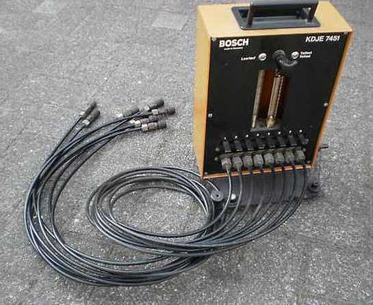| Bei stehendem Motor wird die Kraftstoffmenge gemessen, die der Mengenteiler an die Einspritzdüsen unter simulierten Betriebsbedingungen abgibt. Dazu gibt es ein Mengenvergleichsmessgerät KDJE-P300 bzw. KDJE7451 von Bosch. Letzteres wurde z.B. für über 220 Euro bei e**y versteigert und war das Geld nicht wert. Sowas kann man einfacher und selber bauen, siehe Abschnitt 3.4 . | ![]() |