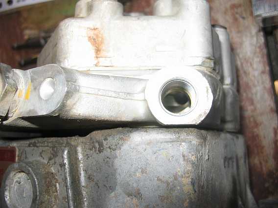 | Vom seitliche Ausgang am Druckdämpfer führt die dickere Leitung mit dem Tecalan-Einsatz zum Warmlaufregler. | ![]() |