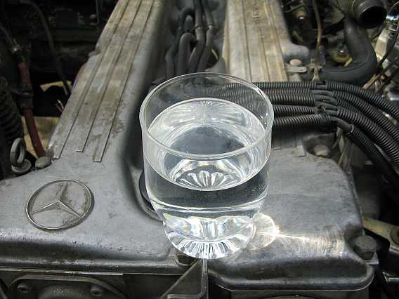 Der Motor muss im Leerlauf bei etwa 850 Umdrehungen absolut ruhig laufen. Ein Wasserglas auf dem Motor zeigt dies (siehe Bild und Video (4,7 MByte). Erst bei warmen Motor kann mit der Leerlaufeinstellschraube die Drehzahl auf diesen Wert eingeregelt werden. Der Zusatzluftschieber ist dann geschlossen. |