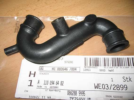 | Ich hatte zunächst nur den Schlauch A1100946582 mit zweitem Anschlussstutzen (Klimaanlage) da, der richtige Schlauch A1100946482 war bestellt. Ein abgesägter Kopf einer M8-Teilgewindeschraube passte luftdicht in die unnötige Öffnung (Pfeil). Alle Schläuche sind im Abschnitt 10. Teile abgebildet.
