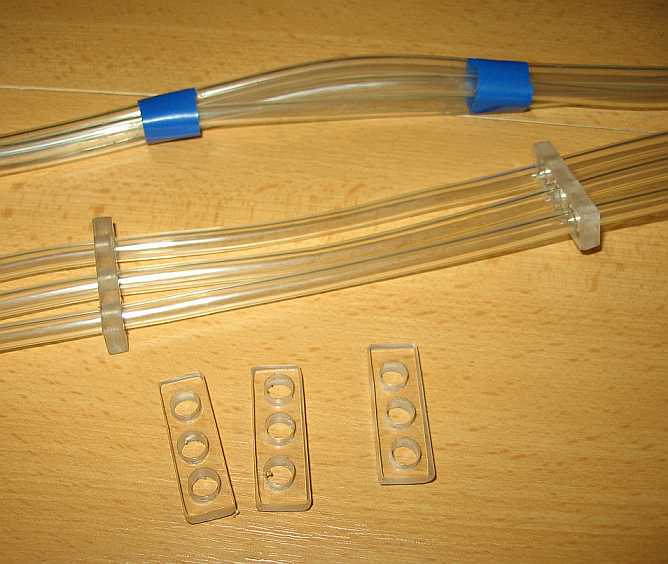 | Besser als das blaue Isolierband um die Leitungen ist eine Halterung aus Polycarbonat. Kleine Streifen 35 x 10 mm bekommen je drei 6 mm große Löcher. | ![]() |