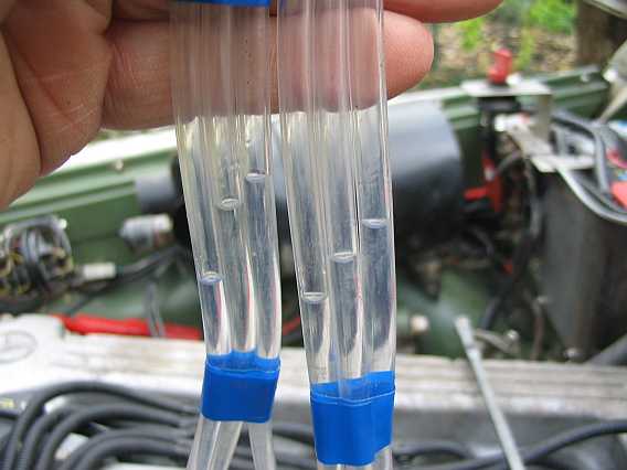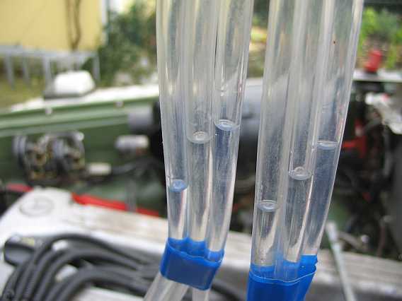 | Eine Metallleitung ist da zum Testen besser. So können auch Einspritzdüsen getestet werden, ob sie nachtropfen. Das Volumenmessgerät bleibt mit 5 Leitungen angeschlossen, damit nicht Benzin in das Saugrohr gelangt. Von den 6 ausgebauten alten Düsen hatte nur eine Düse einen brauchbaren Strahl, der Tausch der Einspritzdüsen damals war also richtig. | ![]() |