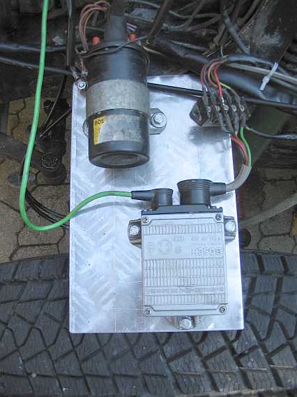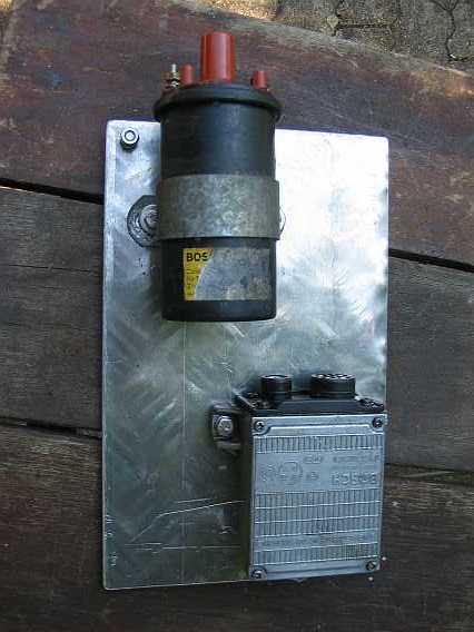 | Testlauf: Zündspule und Transistorsteuergerät sind innen an der linken Spritzwand angeschraubt. Zum Motortest habe ich beide auf eine 5 mm starke Aluplatte geschraubt. |