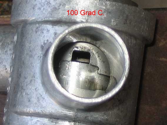 | Mit einem Heißluftföhn wird unter Temperaturkontrolle der ausgebaute Zusatzluftschieber (Kühlwasser vorher ablassen) langsam bis 100 Grad Celsius erwärmt. | ![]() |