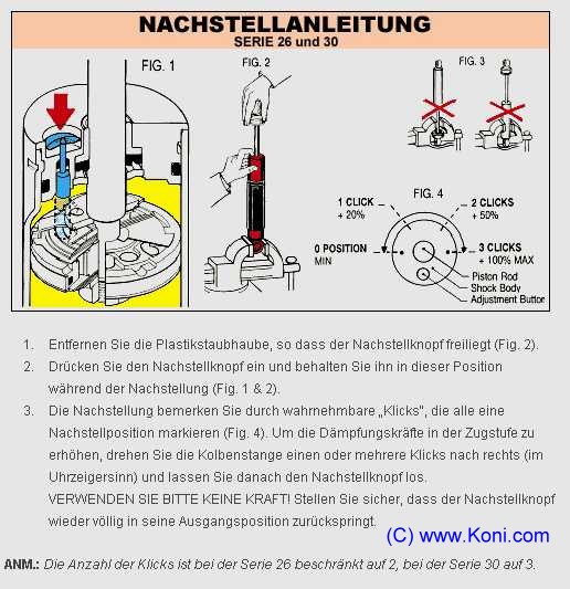 Dazu muss nach Abdrücken der Plastikstaubhaube und Anheben der Plastikscheibe der Nachstellknopf während der Einstellung dauernd gedrückt werden. Zuerst dreht man die Kolbenstange entgegen dem Uhrzeigersinn auf die Grundstellung (Auslieferungszustand). Beim Drehen sind die Rastpunkte fühlbar. Von der 0-Position ausgehend, dreht man zur Erhöhung der Zugkräfte im Uhrzeigersinn die Kolbenstange: 1. Rastpunkt +20%, 2. Rastpunkt +50%, 3. Rastpunkt +100%max. Die Nachstellanleitung für diese Stossdämpfer Serie 30 war auf der Webseite von Koni, Rubrik "Technik" zu finden oder als JPG "hier". |