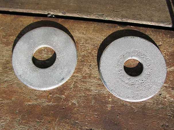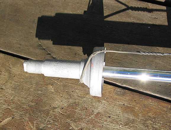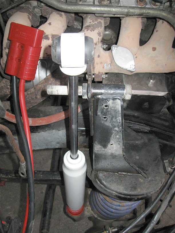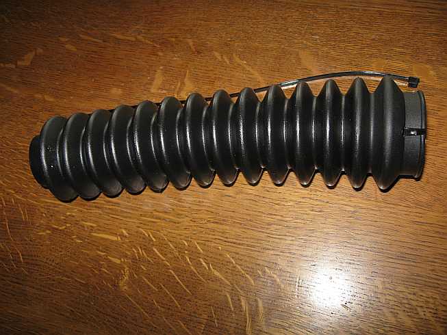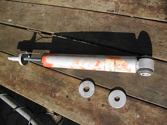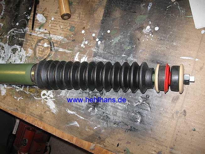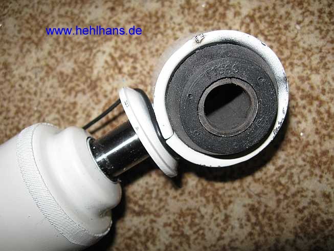 | Den Gummibalg habe ich am Stoßdämpfer mit einer soliden V2A-Schelle (40-60mm) befestigt. Seitlich kommen bei der oberen Öse noch zwei große V2A-Scheiben hinzu. | ![]() |