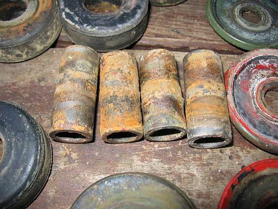 | Die Dämpfergummis können mit einem alkoholischen Rostlöser, der gleichzeitig Gummi pflegt, gereinigt werden. Zuvor kratzt man die Rostrückstände mit einem Schaber ab. Die Schutzrohre werden mit Wasser von den Schlammrückständen im Inneren gereinigt. | ![]() |