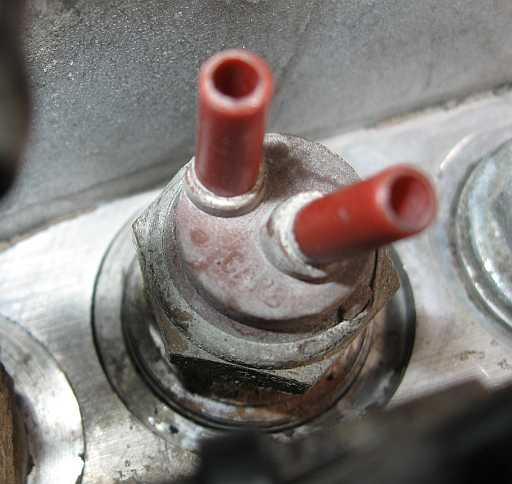 | Zum Ausbau müssen neben den drei Inbus-Schrauben auch die kleine Entlüftungsleitung abgeschraubt werden. | ![]() |