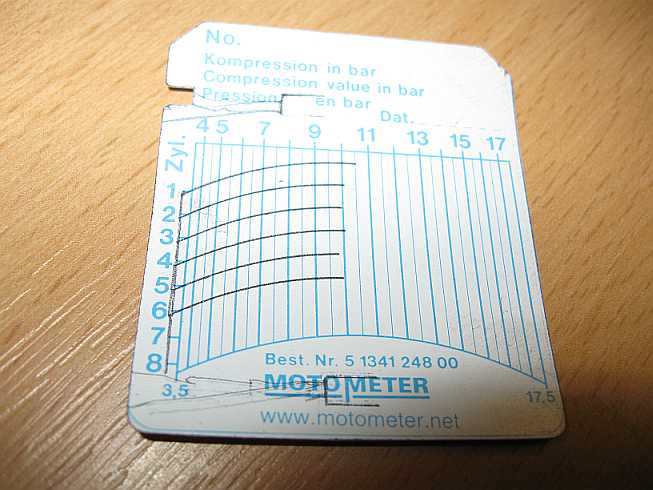 Messwerte (bar): 1. Zyl. 10,5 - 2. Zyl. 10 - 3. Zyl. 10 - 4.Zyl. 10 - 5.Zyl. 9,8 - 6.Zyl. 10 |