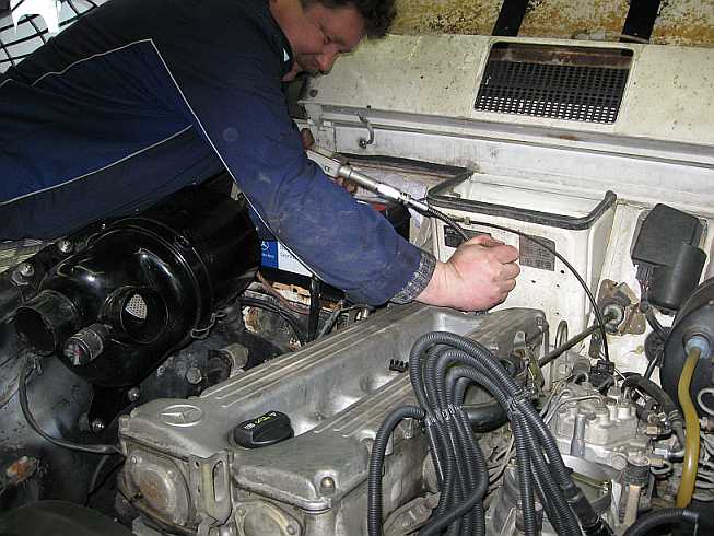 | Benötigt werden der Ventileinstellschlüssel von Hazet Nr. 2771 (Mercedes W110589010100), der Dichtungssatz A11001008300 und die Ventillehren. | ![]() |