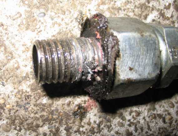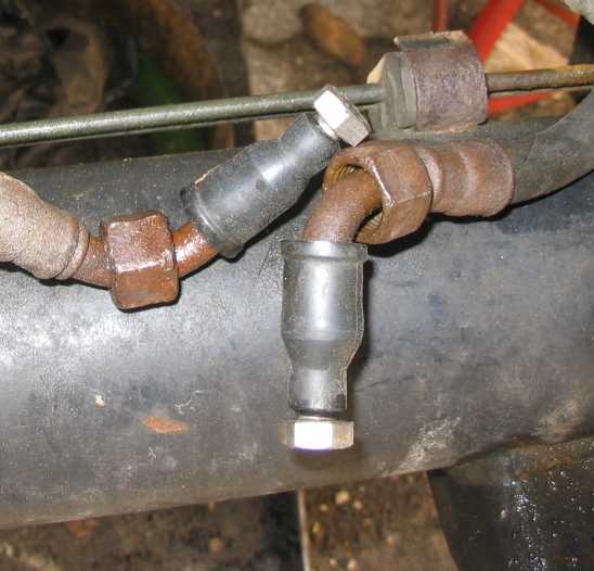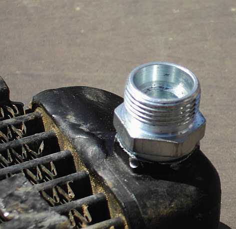 Bild 2: Seitenansicht des Stutzens Bild 3: Stutzen verschraubt. Bild 4: Druckluft-Anschluß zum Ausblasen der Späne während der ganzen mechanischen Arbeiten, sowie dem abschließenden Testen der Dichtheit Bild 5: Der Verschluß zum Prüfen der Dichtheit. Ich habe auf die Schnelle keine Verschluß-Kappe gefunden, also hab ich ein Stück Rohr 15L zusammen gedrückt und verschweißt. |