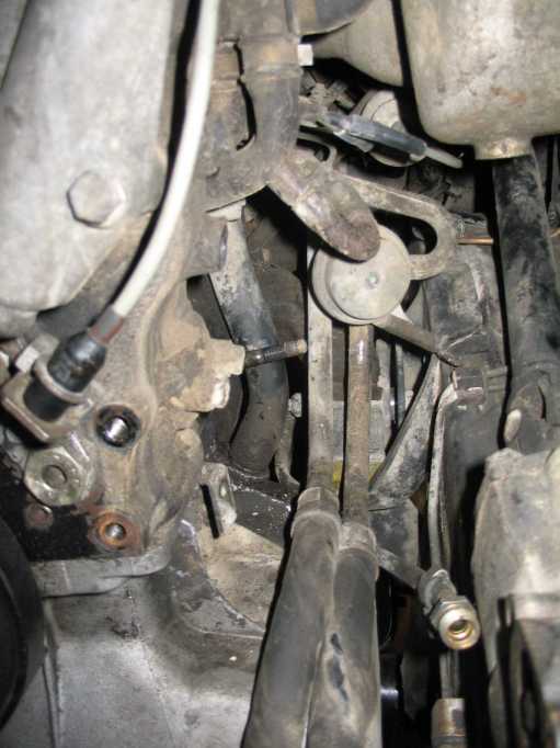 | Nur mühsam konnte ich mittels Spiegel die zwei Schrauben entfernen. Die Mutter erreichte ich vom linken Kotflügelraum aus, über der Bremsleitungshalterung war etwas Platz für die Verlängerung der Ratsche. |