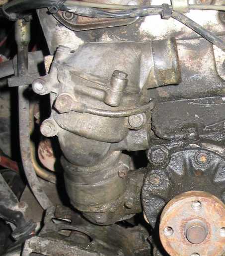 | Wenn sowieso schon der Kühler ausgebaut ist, kann auch gleich der Thermostat mit Gehäuse nachgeschaut werden. Dies war auch notwendig, wie sich herausstellte. | ![]() |