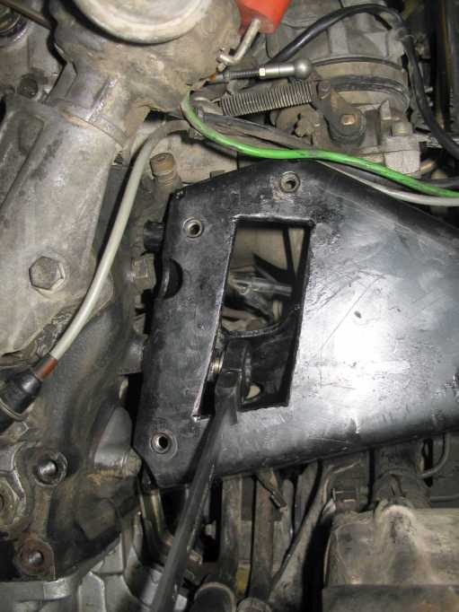 | Nun kommt man von vorne an die Schrauben des Halters. Nach dem Umbau der Innenwand vom linken Kotflügel ist nun alles von zwei Seiten bequem erreichbar (siehe Tipp 98-6, Nr. 2). Die untere Öse der Lenkhilfpumpe war nicht verwendet. Die Pumpe liegt mit der Bodenfläche am Träger auf. | ![]() |