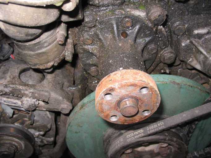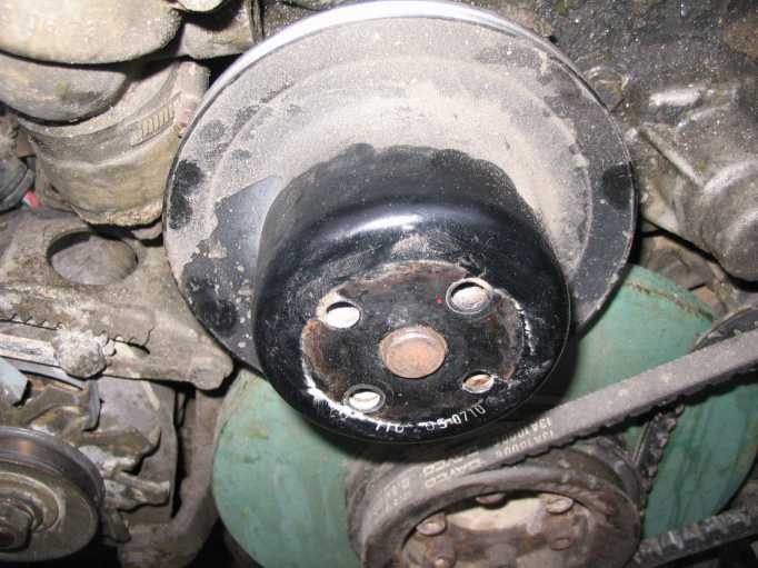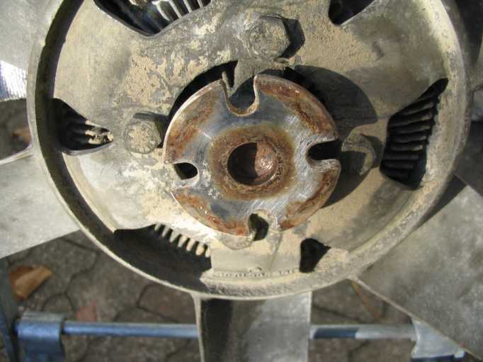 Als ich anfangs September 2009 mal den Lüfterflügel von Hand drehen wollte und das nur mit Gewalt ging, baute ich den über 25 Jahre alten Viskolüfter aus. Die Achse im Lüfterantrieb war fest. So kaufte ich einen neuen Lüfterantrieb. Der Flansch am Antrieb lässt sich nun auch mit der Hand drehen. Bei der TAT 2010 riß von einem Flügel ein Stück ab. |