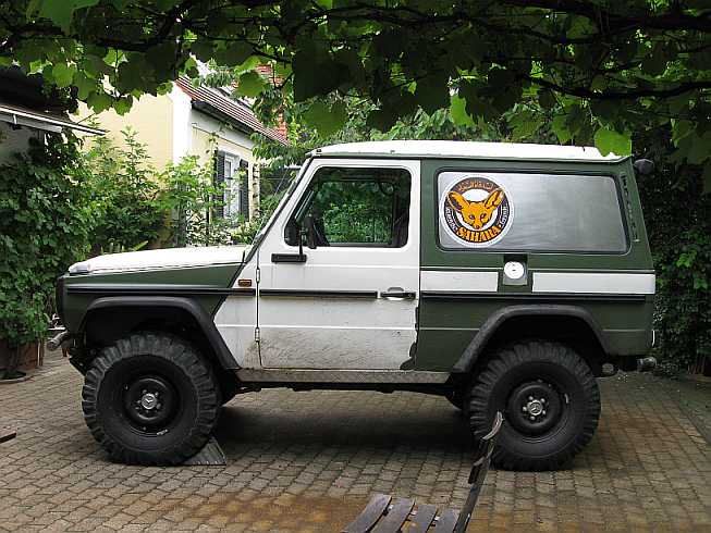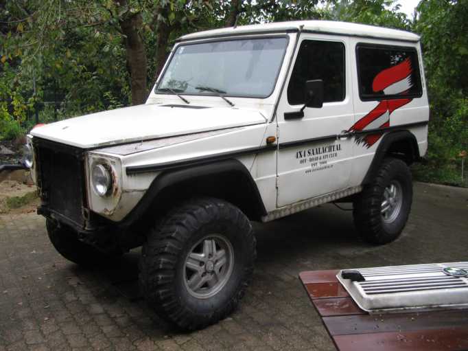 | 2. Es kam anders: Eines Morgens anfangs Juli 2008 bekam ich von meinem Trophy-Freund eine email: bei "3.2.1..meins" wird ein Puch 280GE Baujahr 1984, Standort Salzburg, angeboten (Angebotsende 20.00 Uhr). Der 280GE war schon wettbewerbsmäßig umgebaut (Seilwinde, Bodylift, Schalensitze, Vierpunktgurt, Innentank usw.) und fahrbereit, aber überholungsbedürftig, wie der österreichische Besitzer meinte. Etliche Telefonate später war es klar, wir bieten mit. Und drei Sekunden vor 20.00 Uhr hatten wir mit unserem nur etwas darüber liegenden Gebot Erfolg und den 280GE. |