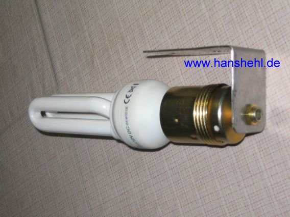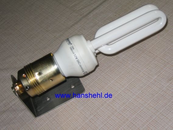 Nun gibt es 12 Volt-Energiesparlampen, deren Lichtleistung einer 75 Watt-Glühbirne (230V) entspricht, die aber nur etwas über 1 Ampere Strom (15 Watt) verbrauchen (Fa. ELV, Nr. 6044103) und einen normalen E27-Schraubsockel besitzen (Reichelt.de: SOLSUM ESL11). |