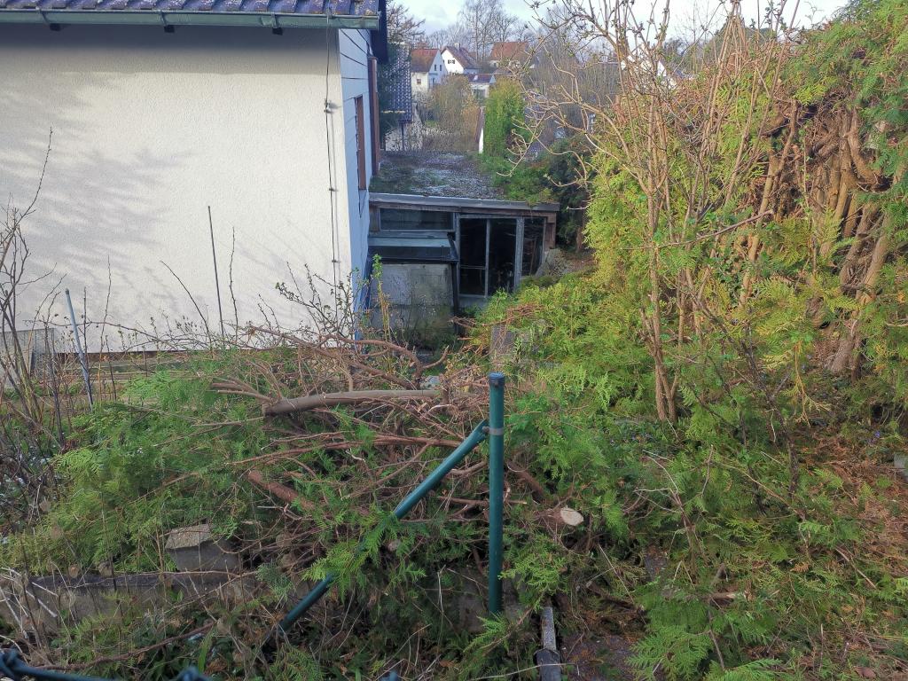 Am Freitag, 21.04.23 half mir Piet im Garten, vielen Dank! Am 04.04.1994 standen noch beim Haus oberhalb des Sitzplatzes am Nußbaum zwei große Thujen. Nachdem die Fa. Fenk sie am 03.11.2003 gefällt hatte, wucherte der Efeu um den verfaulenden Doppelbaumstumpf (3. Bild: 15.04.2018). Nun musste der alte morsche Doppelbaumstumpf weg. |