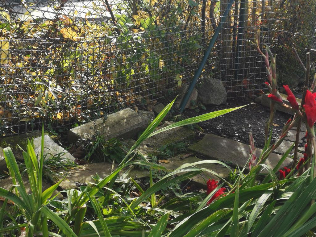 Der alte Drahtzaun zum linken Nachbar Philipp war über 35 Jahre alt und defekt, untere Spanndrähte waren durch Bewuchs gerissen. Jessy nützte dies mehrmals zur Erkundung der Nachbarschaft, bis die damals gebauten stabilen und verzinkten Gitter (schon 23.04.2003 gebaut) dies verhinderten. Die Beetkanten am provisorischen Weg am Zaun standen schief und Jessy lag auf den Laubhaufen in der Sonne. |