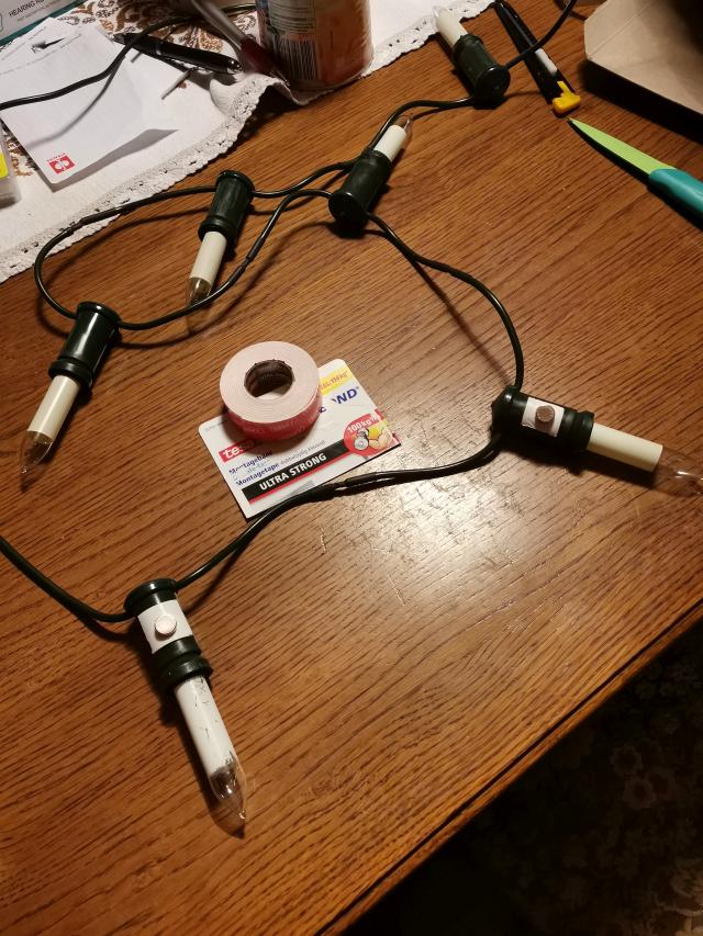 7 Kerzen können mit 60 V betrieben werden. Beide Netzteile sind in Reihe geschaltet. Da aber ein Netzteil nur max. 60 V liefert, war die Lösung eine Reihen- und Parallelschaltung der 14 Kerzen mit der Hälfte der Kerzen (2 Stränge parallel mit je 7 Kerzen in Reihe, Verbrauch 16 W). |