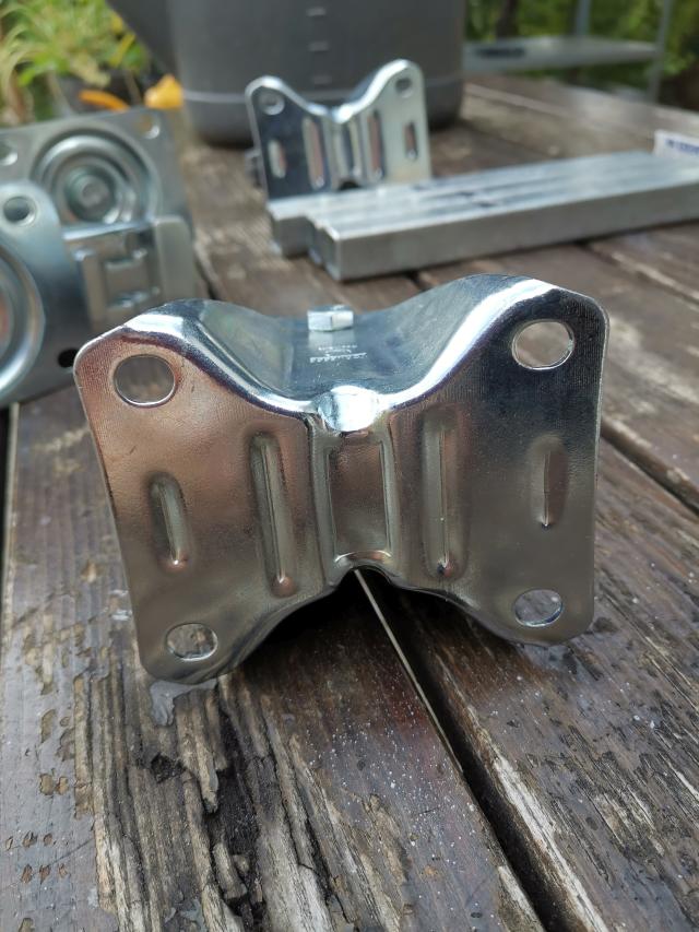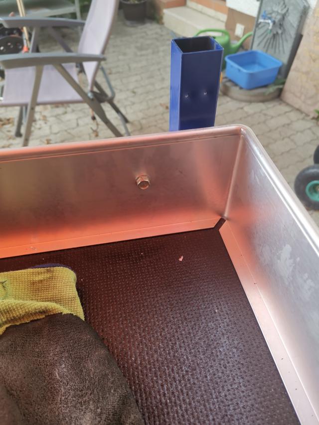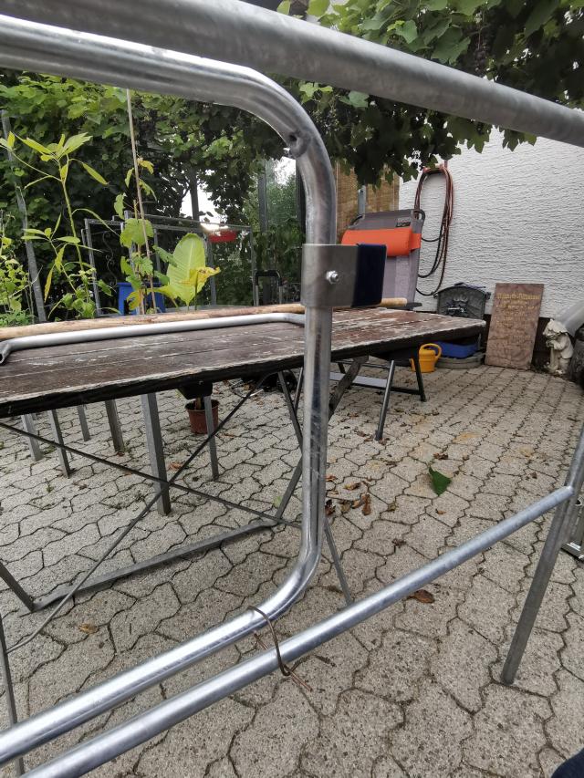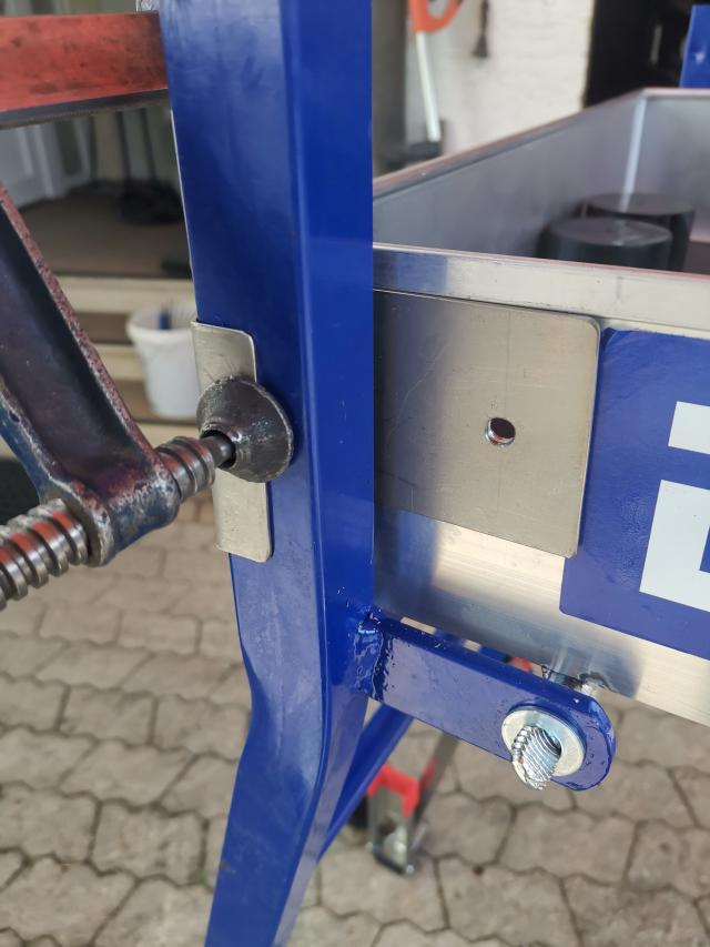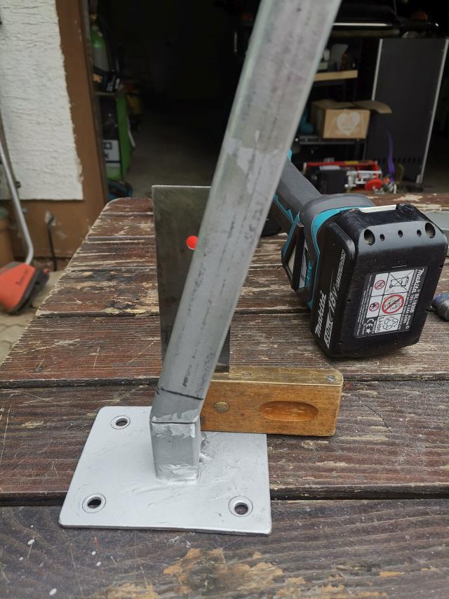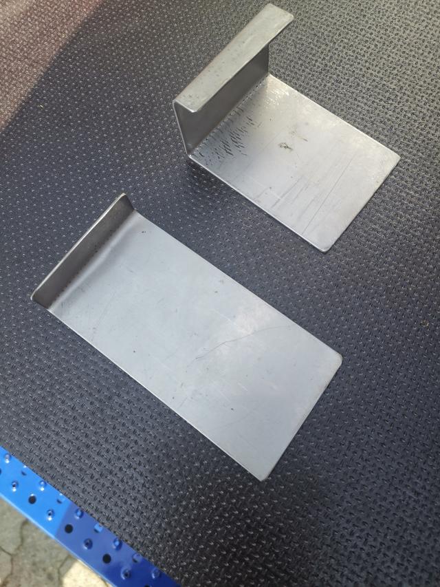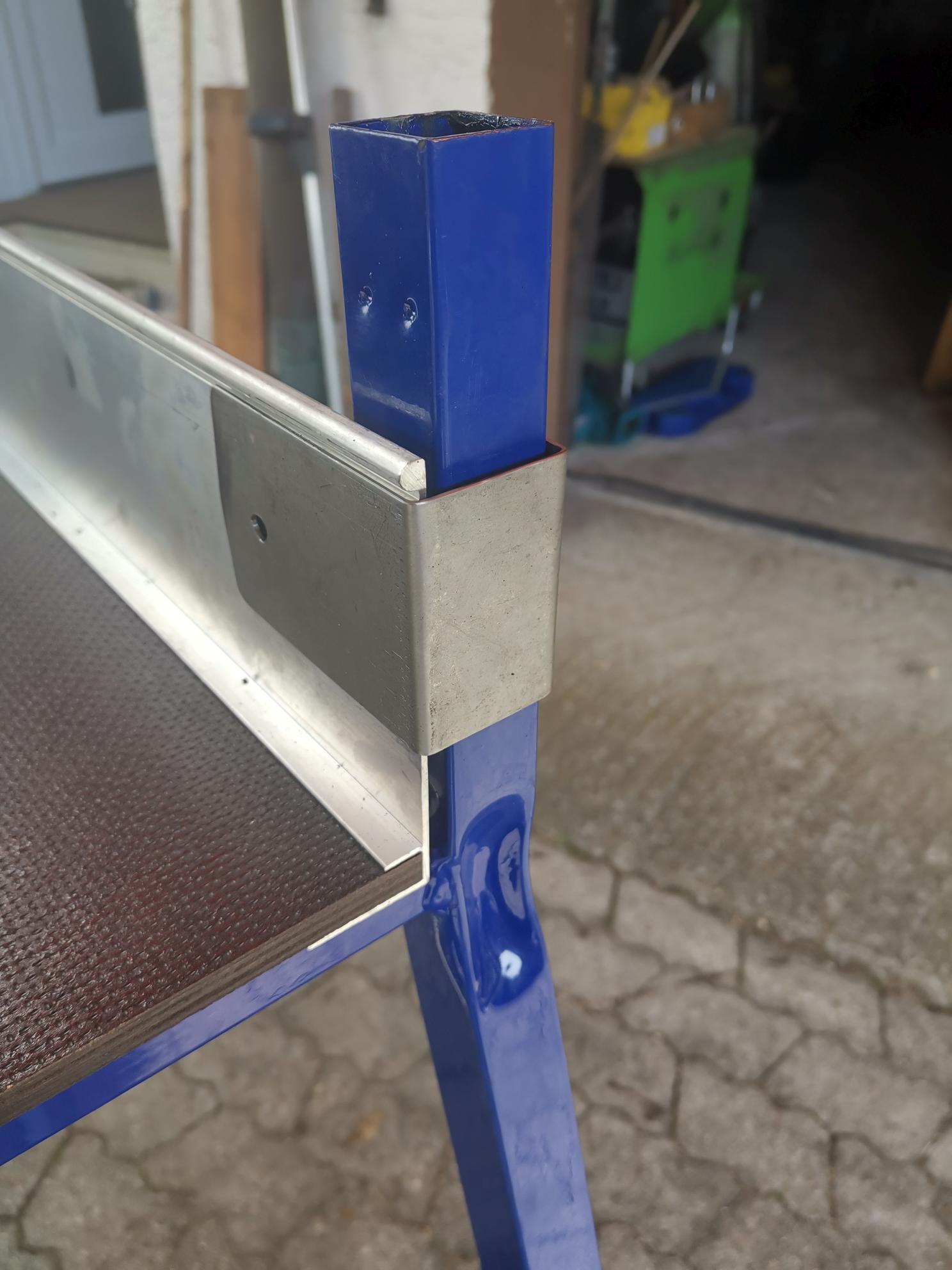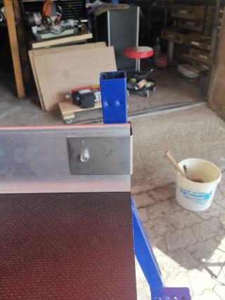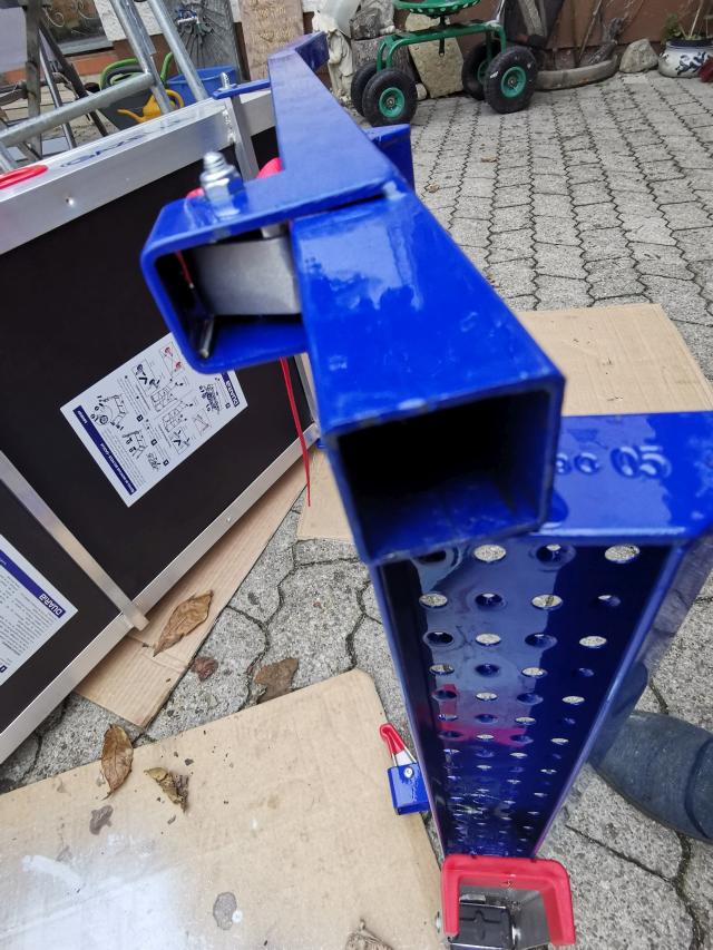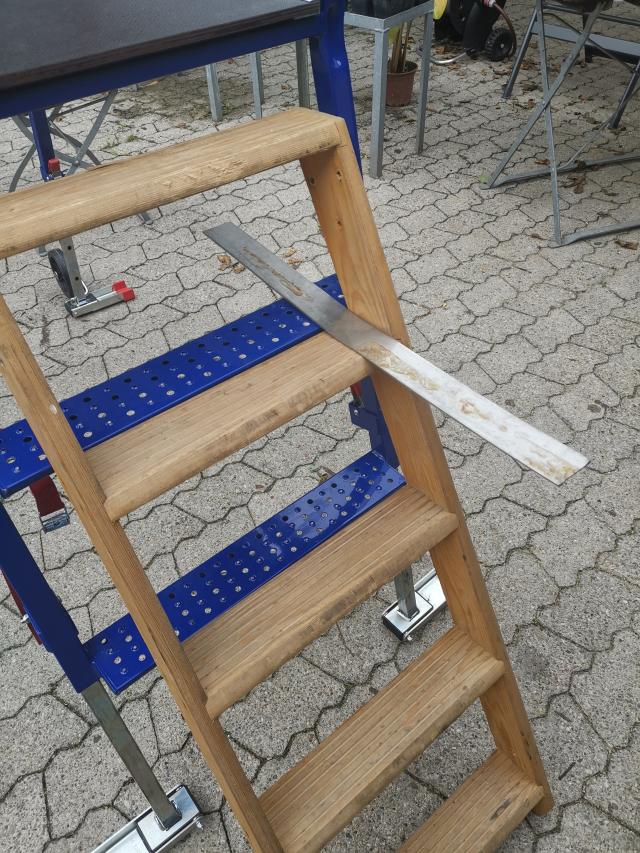 Am einfachsten war es entsprechend dem Winkel einen Keil (auf 3 Seiten) zu flexen und die 4. Seite zu biegen. Damit ist die Anschraubplatte wieder waagrecht und die Bühne läßt sich leicht lenken. |