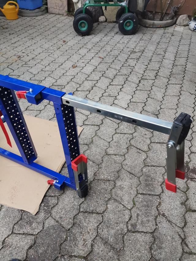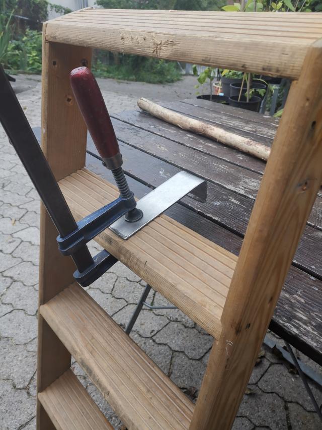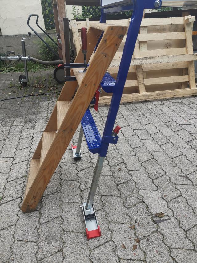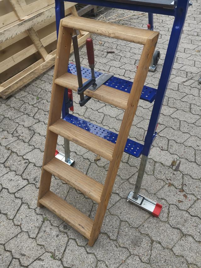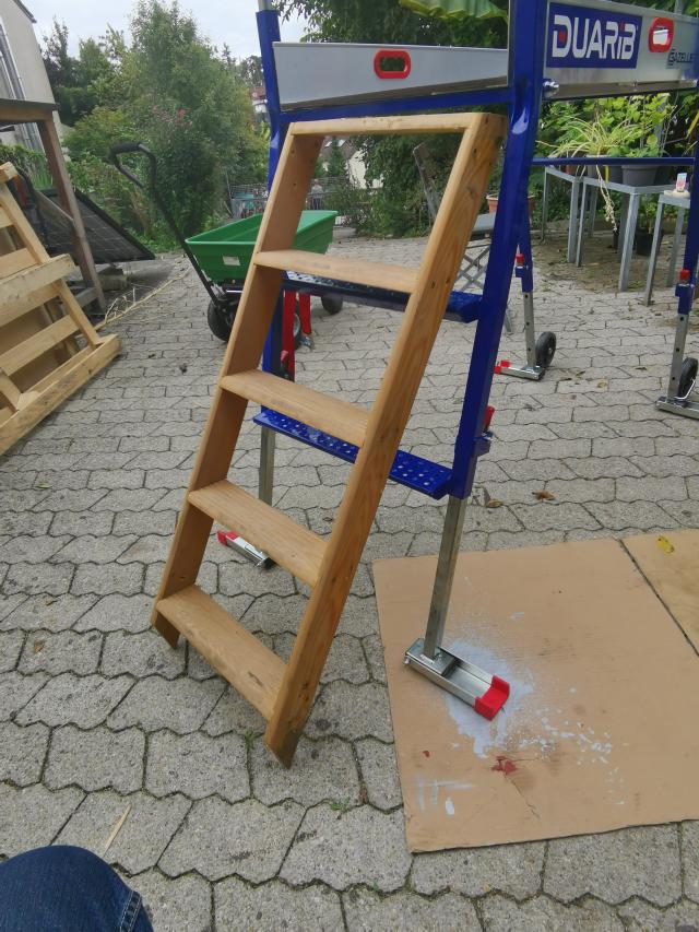 Die Treppe zur Arbeitsplattform hat nur 2 Stufen und ist bei der maximalen Höhe relativ steil. Das obere kurze Teil meiner alten Holzspeichertreppe ermöglicht bequemes Hochsteigen. |