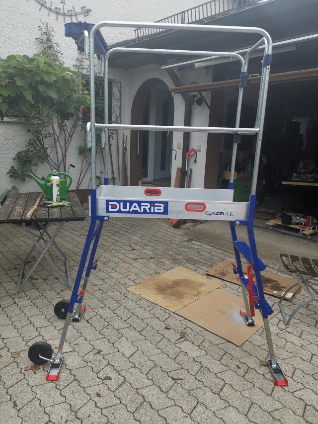 Aber bei Arbeiten wie z.B. Reinigen der Haus-Außenlampen ist sie zu niedrig. Mit 82 (Stand Spetember 2025) steige ich nicht mehr auf eine Leiter. Bei der Suche im Internet fand ich die Webseite der Firma stehleiter-experten.de/podestleiter-teleskkopisch-gazelle-4860.htm Matisiere mit der Arbeitsbühne Gazelle (bis 3 m) Nr. 4007710 zum Gesamtpreis 697,10 EUR mit Sicherheitsgarantie,die ich am 29.07.2025 per paypal bezahlte. Sie ist klappbar, nur 60 cm breit, die Höhe der Arbeitsbühne beträgt 1 m, auf 4 Seiten ein hohes Gitter mit Klappöffnung. Produktblatt Gazelle 400071 |