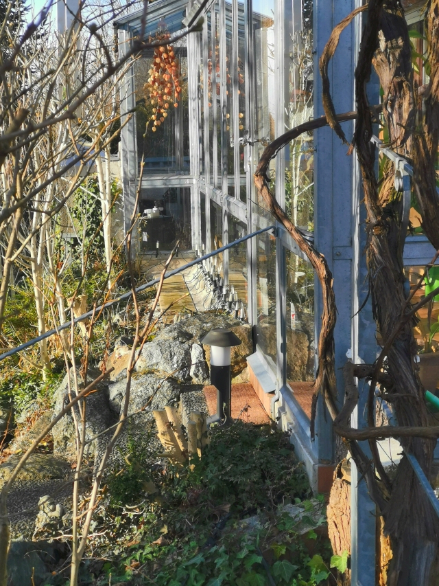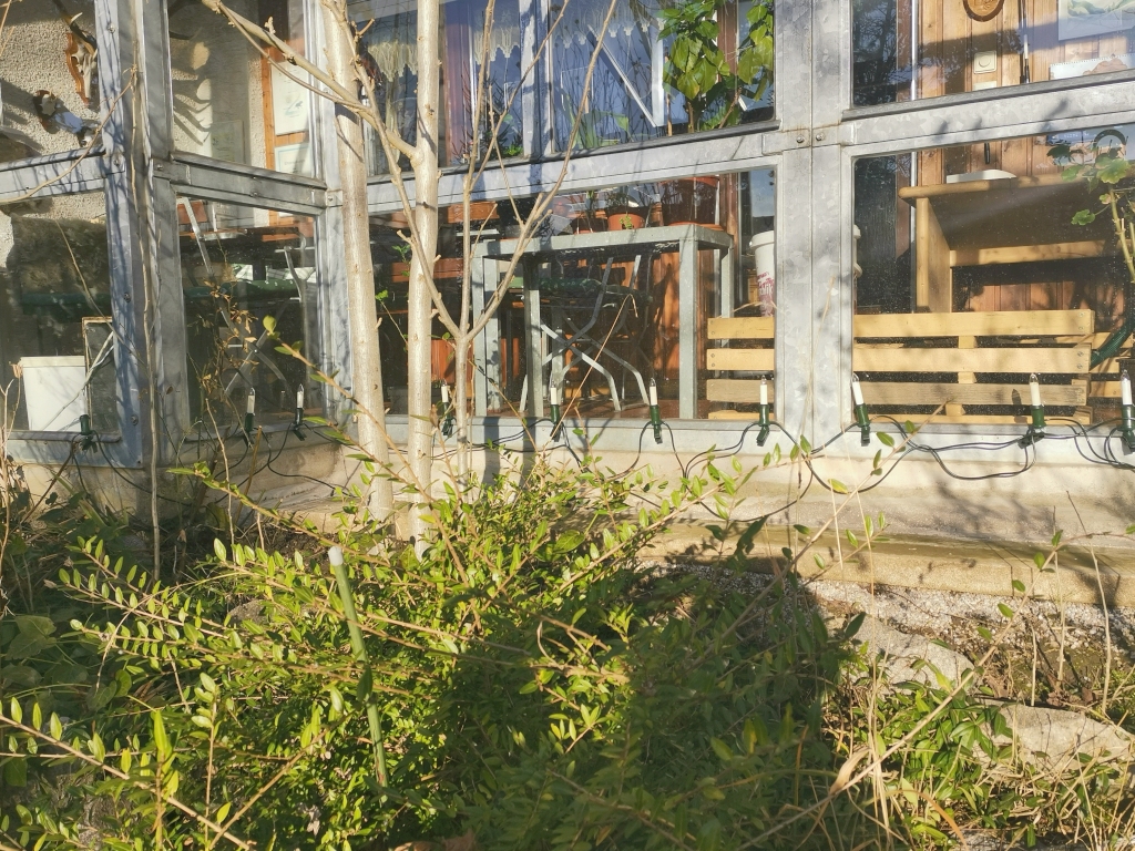 Im Sommer stehen die Pflanzen im Freien, daher ist viel Platz für Bierbänke und Parties, wenn es regnet. Und man kann gut die Nüsse vom Walnussbaum trocknen (Kästen natürlich selber gebaut). |