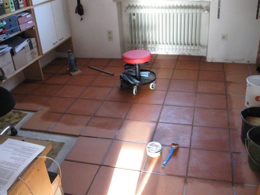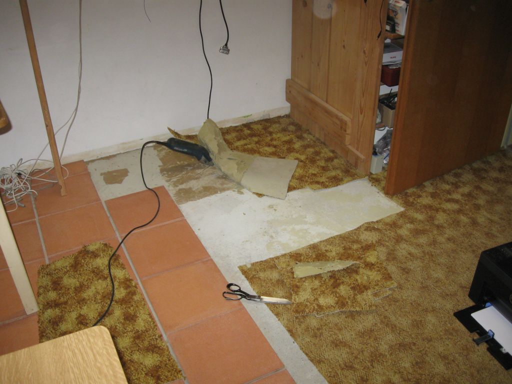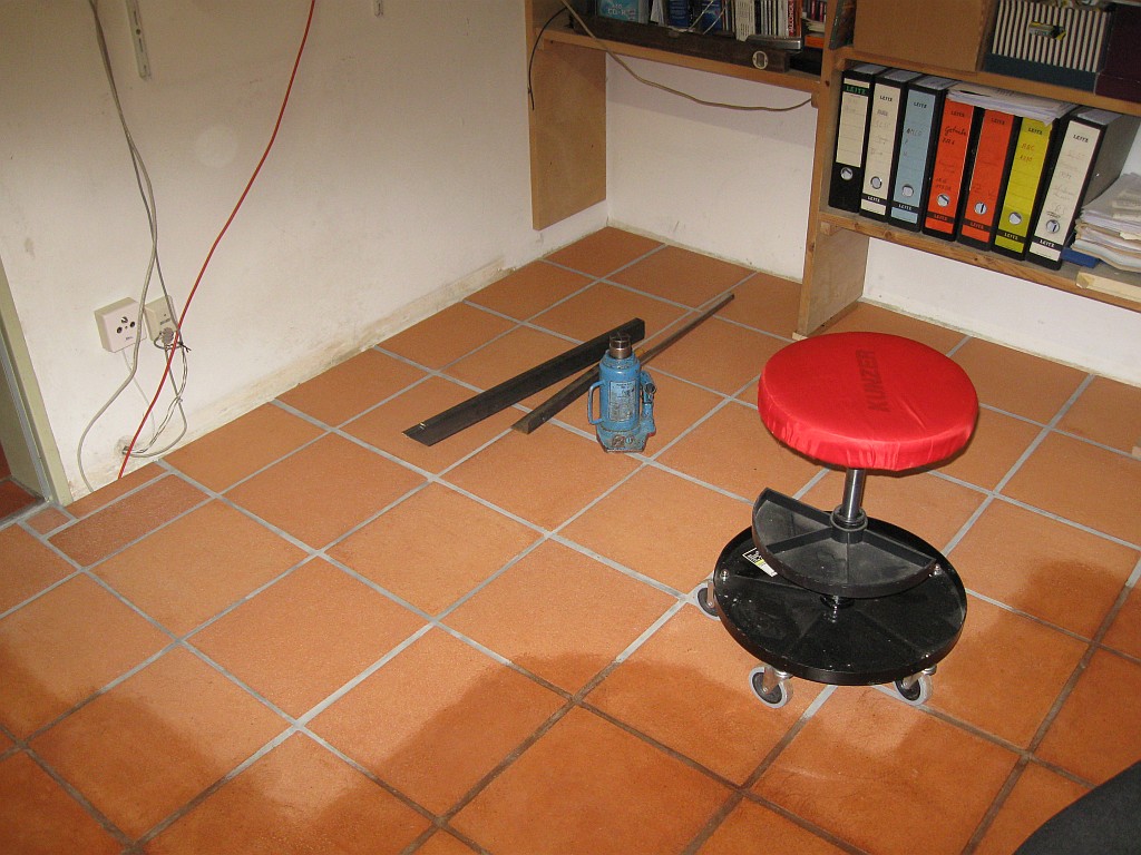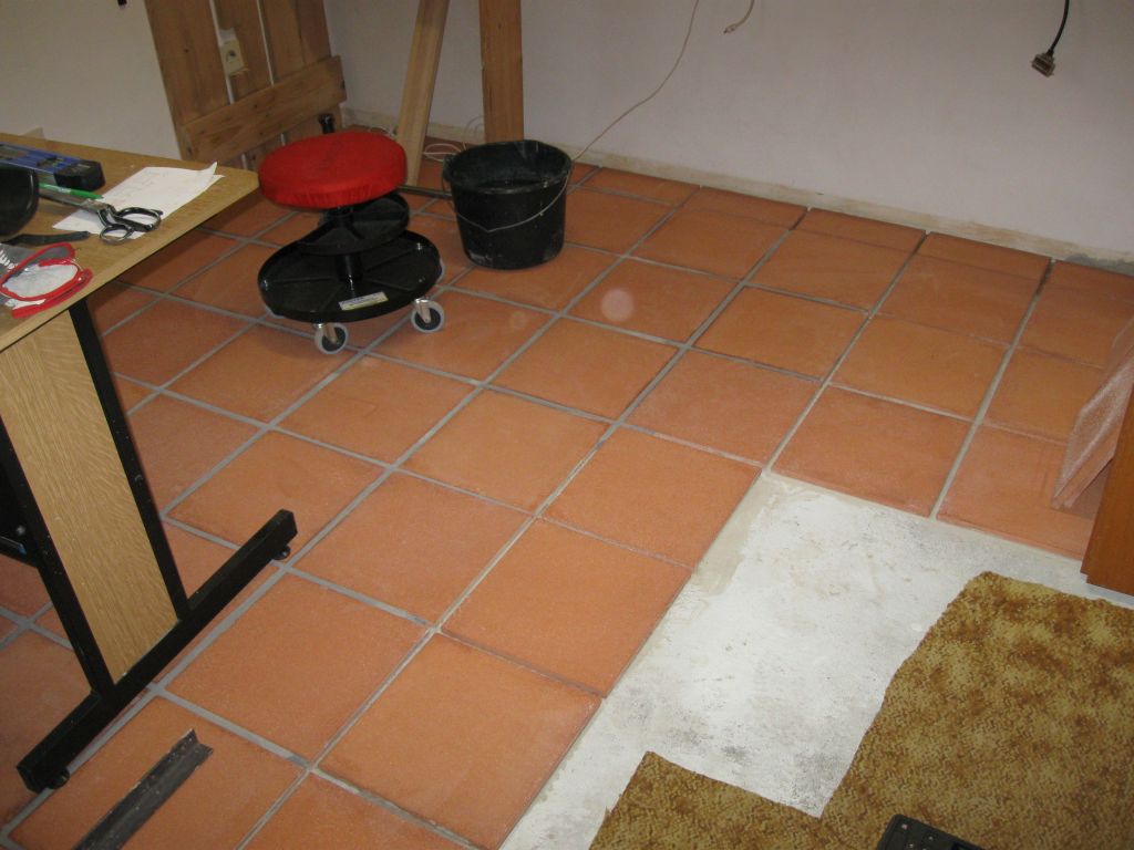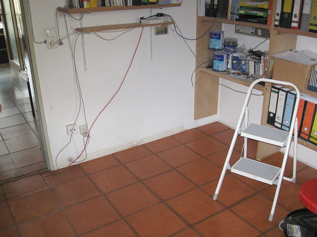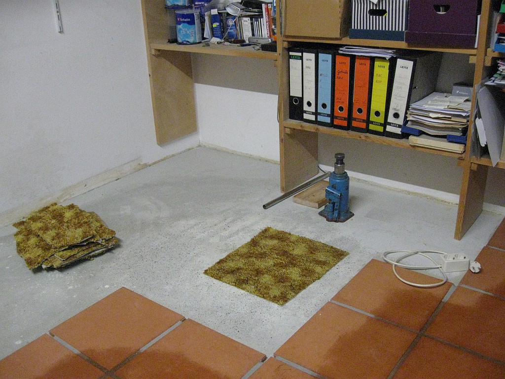 Am 02.01.1996 hatte ich begonnen, den alten Teppichboden im Wohnzimmer zu entfernen und mit Terracotta zu belegen. Jahre später war ein Großteil der Haus-Wohnfläche mit TerraCotta-Fliesen anstelle des Teppichbodens gefliest, wie man auch auf den Bildern sieht. Teppichböden und Jagdhunde passen einfach nicht zusammen. Mein Computerzimmerchen hatte noch den uralten Teppichboden. Der musste nun endlich mal rauß. Er war durch den Bürostuhl schon fast durchgerollt. Da aber die Bücherregale nicht abgebaut werden sollten, wurde abschnittsweise gefliest. Daher dauerte es ab Januar 2018 über 4 Wochen, bis ich die 16 m2 gefliest hatte. |