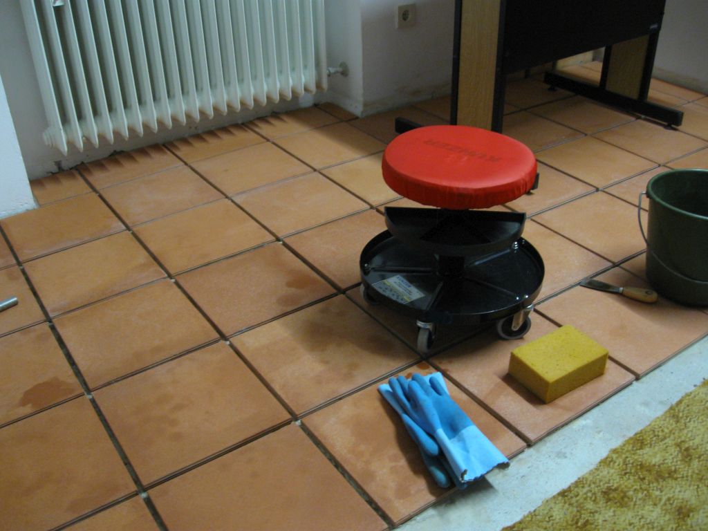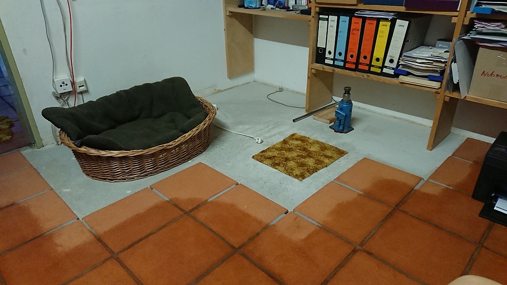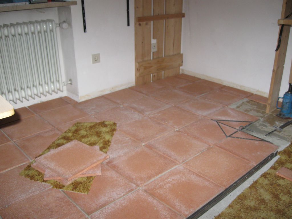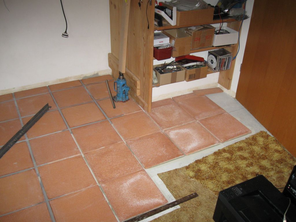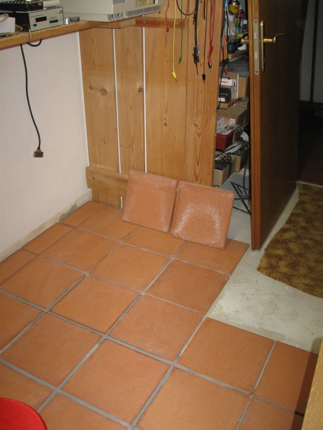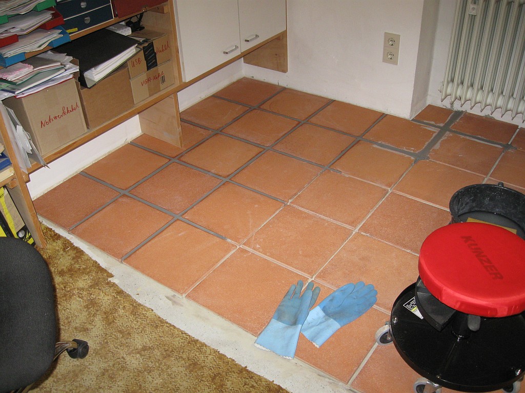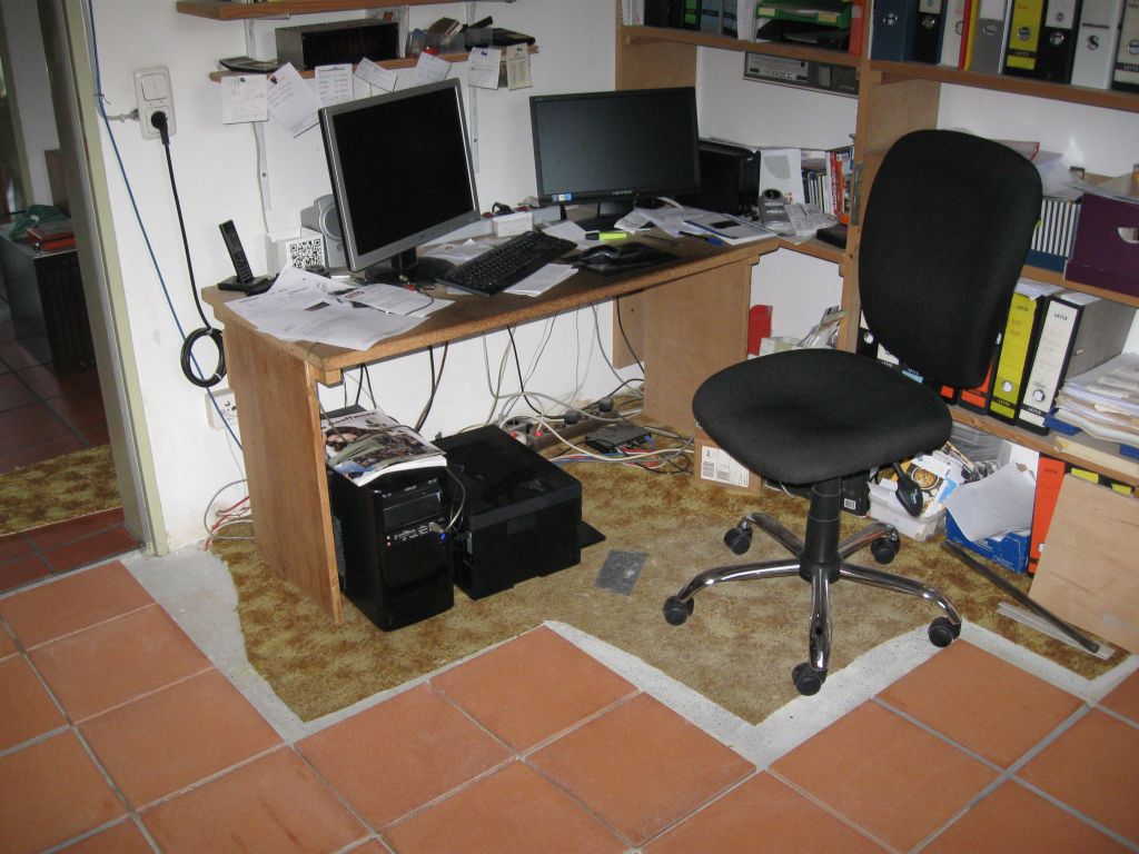Am 02.01.1996 hatte ich begonnen, den alten Teppichboden im Wohnzimmer zu entfernen und mit Terracotta zu belegen. Jahre später war ein Großteil der Haus-Wohnfläche mit TerraCotta-Fliesen anstelle des Teppichbodens gefliest, wie man auch auf den Bildern sieht. Teppichböden und Jagdhunde passen einfach nicht zusammen. Mein Computerzimmerchen hatte noch den uralten Teppichboden. Der musste nun endlich mal rauß. Er war durch den Bürostuhl schon fast durchgerollt. Da aber die Bücherregale nicht abgebaut werden sollten, wurde abschnittsweise gefliest. Daher dauerte es ab Januar 2018 über 4 Wochen, bis ich die 16 m2 gefliest hatte. |