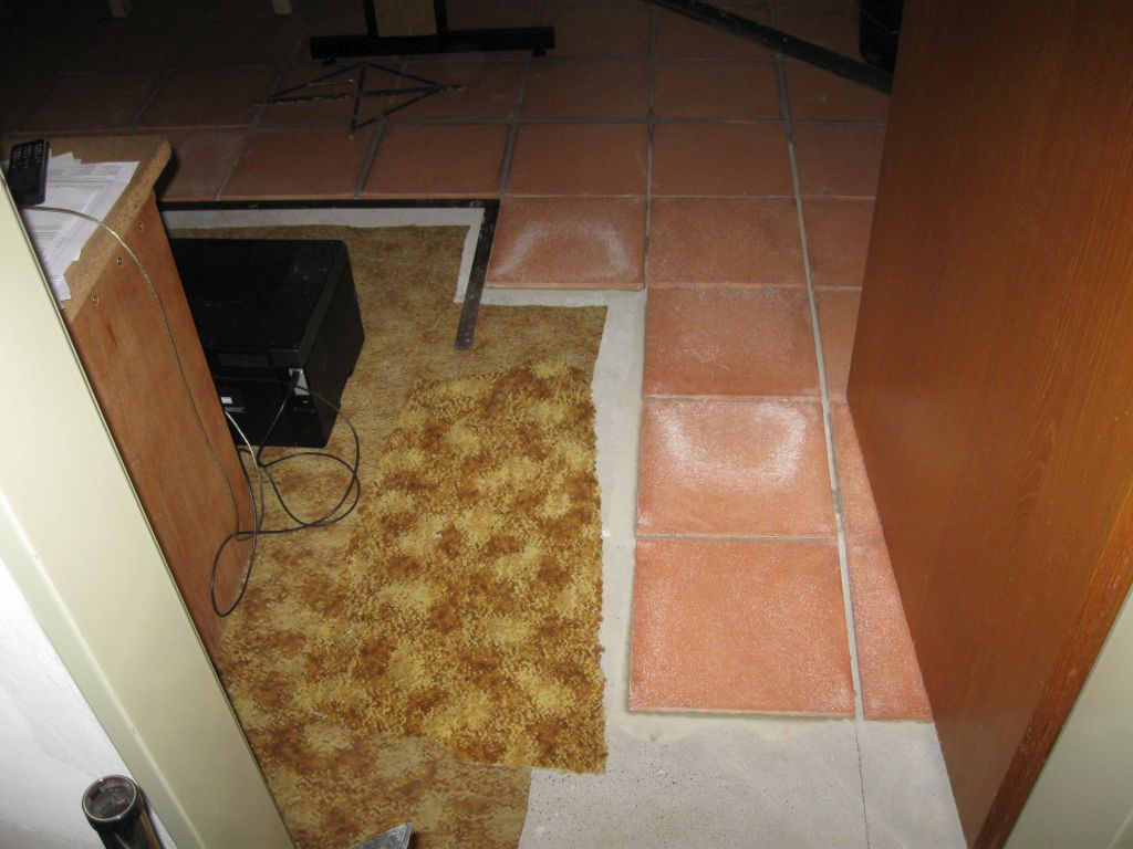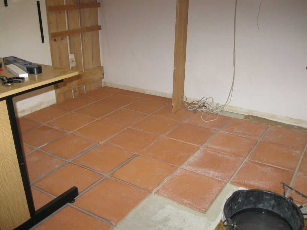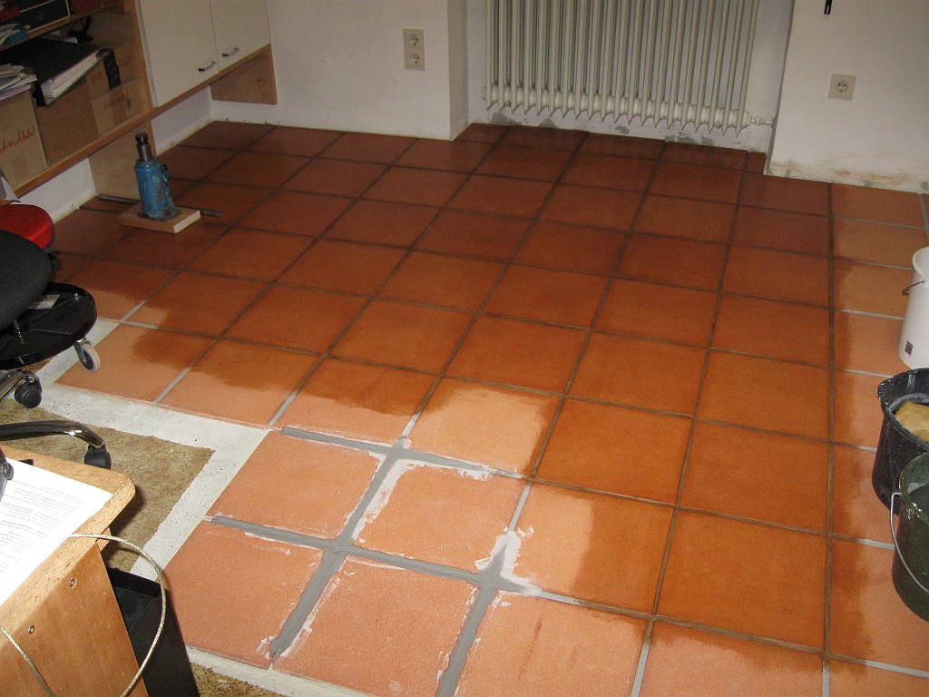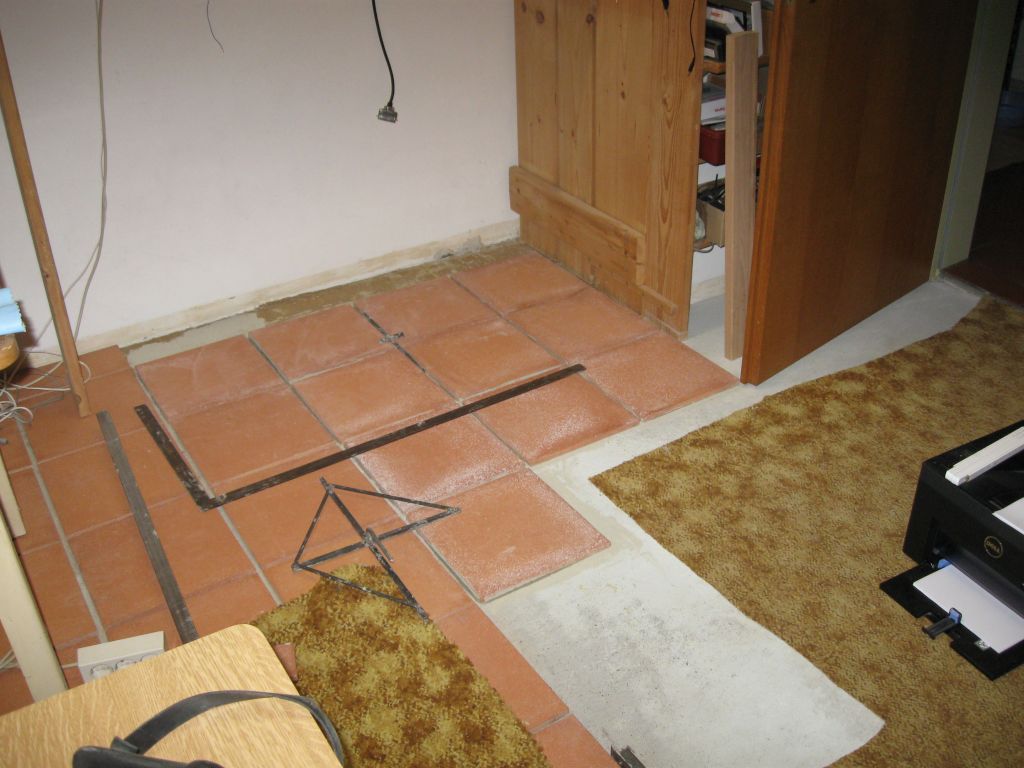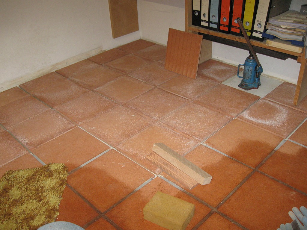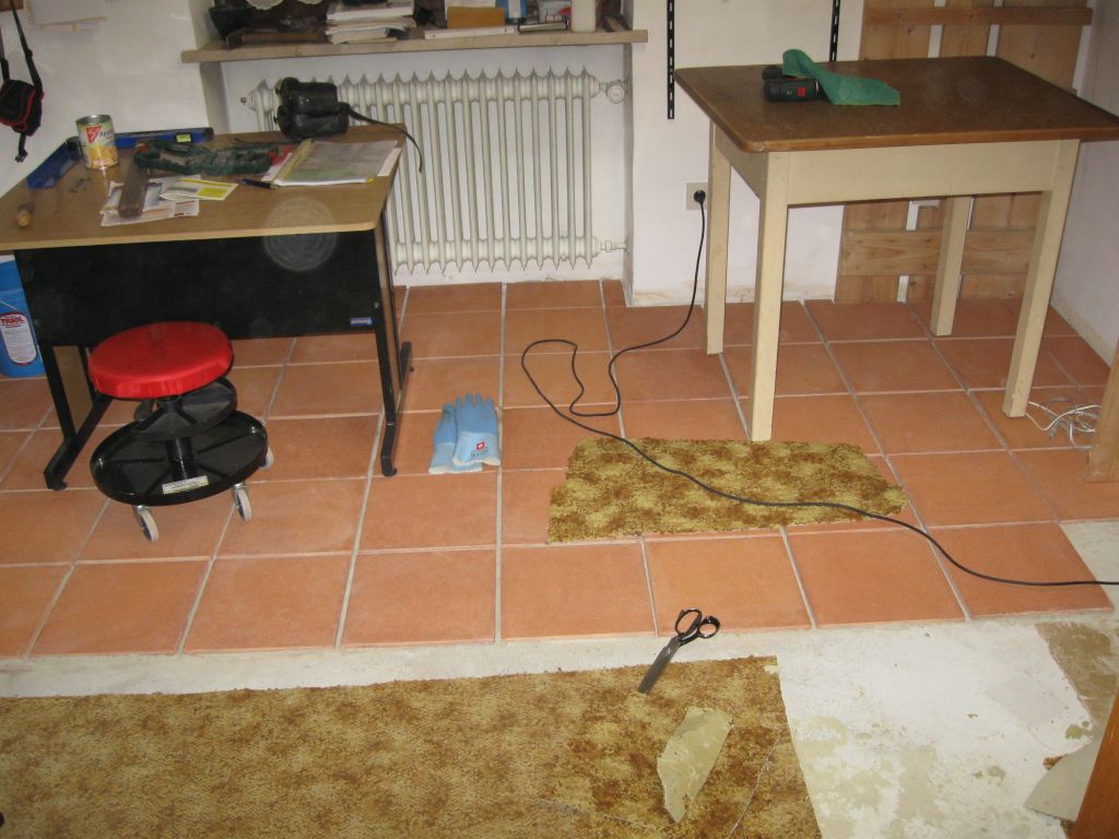 Am 02.01.1996 hatte ich begonnen, den alten Teppichboden im Wohnzimmer zu entfernen und mit Terracotta zu belegen. Jahre später war ein Großteil der Haus-Wohnfläche mit TerraCotta-Fliesen anstelle des Teppichbodens gefliest, wie man auch auf den Bildern sieht. Teppichböden und Jagdhunde passen einfach nicht zusammen. Mein Computerzimmerchen hatte noch den uralten Teppichboden. Der musste nun endlich mal rauß. Er war durch den Bürostuhl schon fast durchgerollt. Da aber die Bücherregale nicht abgebaut werden sollten, wurde abschnittsweise gefliest. Daher dauerte es ab Januar 2018 über 4 Wochen, bis ich die 16 m2 gefliest hatte. |