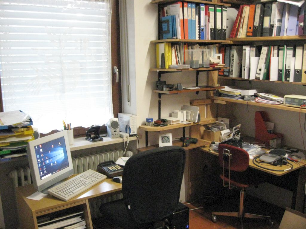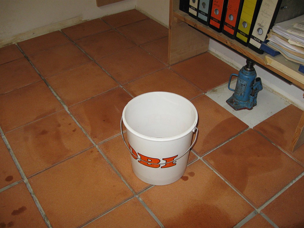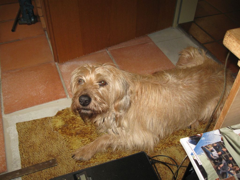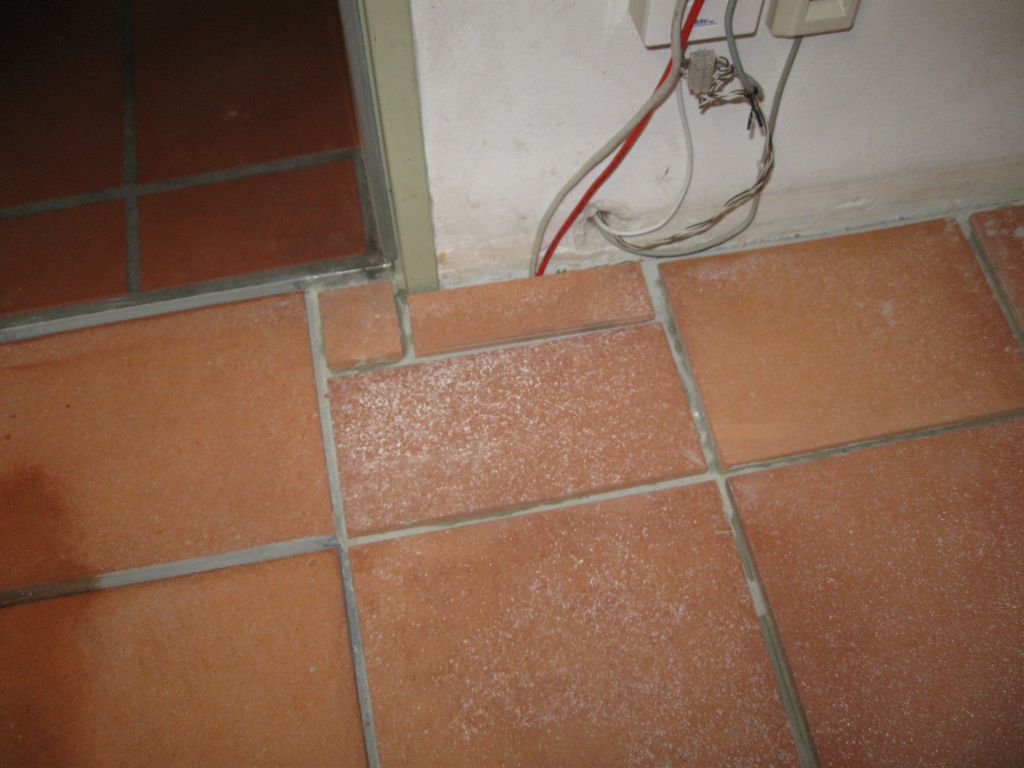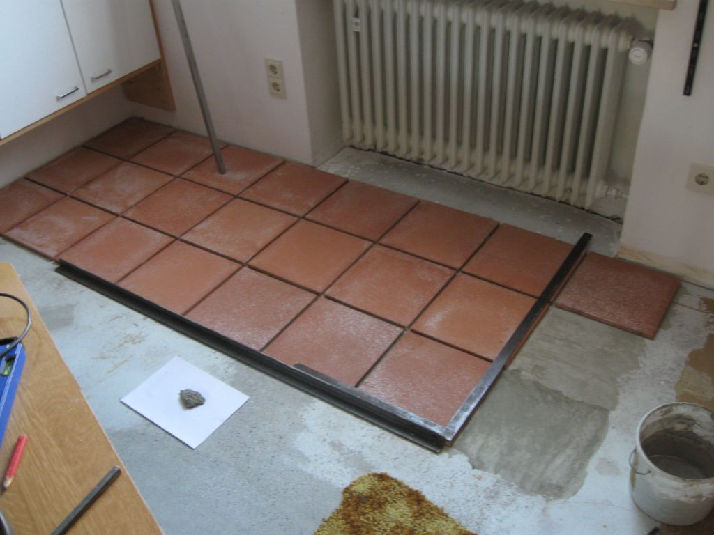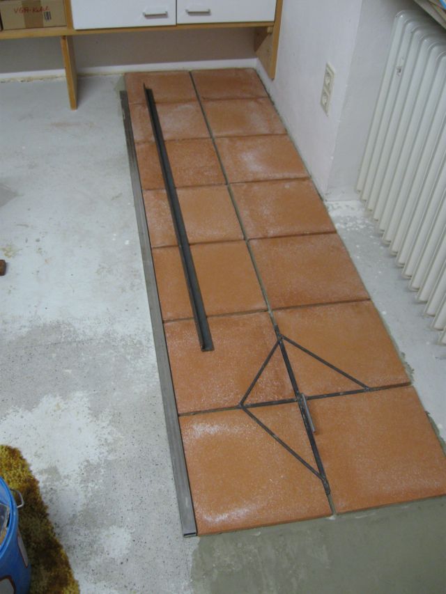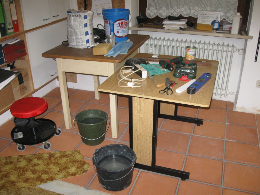 Am 02.01.1996 hatte ich begonnen, den alten Teppichboden im Wohnzimmer zu entfernen und mit Terracotta zu belegen. Jahre später war ein Großteil der Haus-Wohnfläche mit TerraCotta-Fliesen anstelle des Teppichbodens gefliest, wie man auch auf den Bildern sieht. Teppichböden und Jagdhunde passen einfach nicht zusammen. Mein Computerzimmerchen hatte noch den uralten Teppichboden. Der musste nun endlich mal rauß. Er war durch den Bürostuhl schon fast durchgerollt. Da aber die Bücherregale nicht abgebaut werden sollten, wurde abschnittsweise gefliest. Daher dauerte es ab Januar 2018 über 4 Wochen, bis ich die 16 m2 gefliest hatte. |