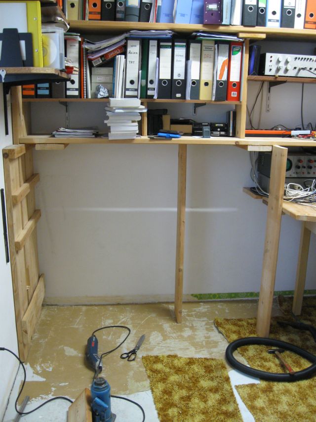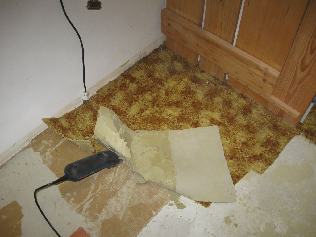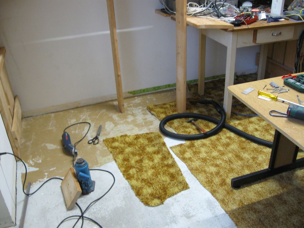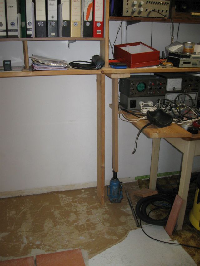Von der linken Ecke unter den weißen Wandschränken wurde der Teppichboden (er war nicht geklebt), auch unter dem Fenster und bis zur rechten Wand entfernt. Die Regale werden mit den Hydraulikheber angehoben. |