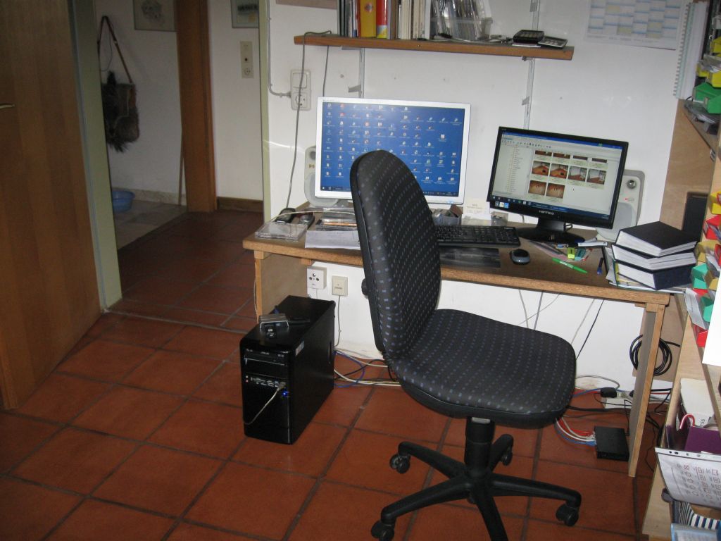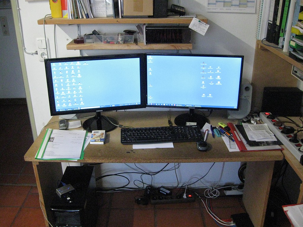 Inzwischen ist fast alles neu eingeräumt und sehr viel ausgemistet. Zwei gleiche Rechner stehen zur Verfügung. Gerda mag das Schafsfell. |