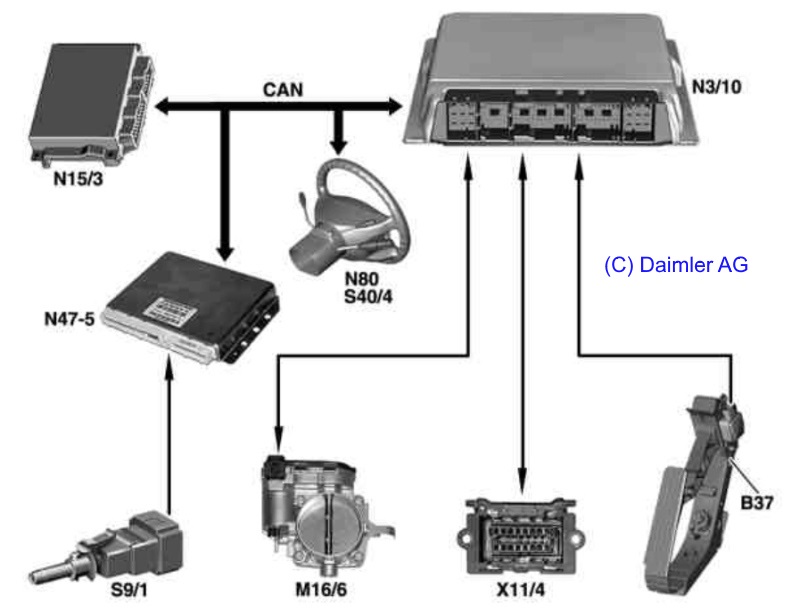 Beim elektronischen Fahrpedal B37 (EFP) liegt eine komplizierte Steuerung vor, wobei ein Hallgeber (beim Typ 230 am Fahrpedal) die Stellung und die Veränderungsgeschwindigkeit als Spannungssignal an das Motorsteuergerät N3/10 ME 2.8.1 liefert. Dieses steuert kennlinienabhängig den Öffnungswinkel der Drosselklappe M16/6 , der durch ein Istwert-Potentiometer an das Motorsteuergerät ME 2.8.1 zurück geliefert wird. Ein zweiter Hall-Geber und ein zweites Istwert-Potentiometer an der Drosselklappe liefern Vergleichswerte für das Motorsteuergerät ME 2.8.1 zur Kontrolle. Weitere Daten werden über CAN mit dem Steuergerät EGS N15/3, (beim 463 mit dem Steuergerät ESP u.BAS N47-5, beim R230 mit dem Steuergerät ESP, PML und BAS N47-5 ) und dem Mantelrohrmodul N80 / Tempomat ausgetauscht, wobei sogar der Bremslichtschalter S9/1 über das ESP vom ME abgefragt wird. Bremsen bedeutet Leerlaufvorgabe. |