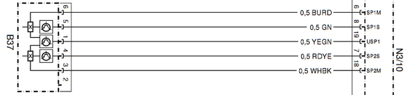 R230 und 463 siehe Schaltplan Blatt 1: B37 Pin 1: USP1: YEGN Spannungsversorgung (5 V) vom Steuergerät ME (N3/10) Pin 3: SP1M: WHBK Masseanschluss Pin 4: SP1S: RDYE Signalspannung 1 (ca. 0,20 bis 2,25 V) Pin 5: SP2S: GN Signalspannung 2 (ca. 0,40 bis 4,50 V) Pin 6: SP1M: BURD Masseanschluss Kabelfarben siehe hier. |