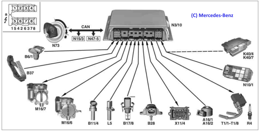 siehe hier Abschnitt 4 siehe Schaltpläne M113.993, Typ 463.270 G55AMG und M113.992, Typ 230.474 SL55AMG: Motorsteuergerät N3/10: siehe Legende und Schaltplan Motorstuergerät N3/10 Blatt 2: PE07.61-P-2101-97KB vom 24.07.2016 |